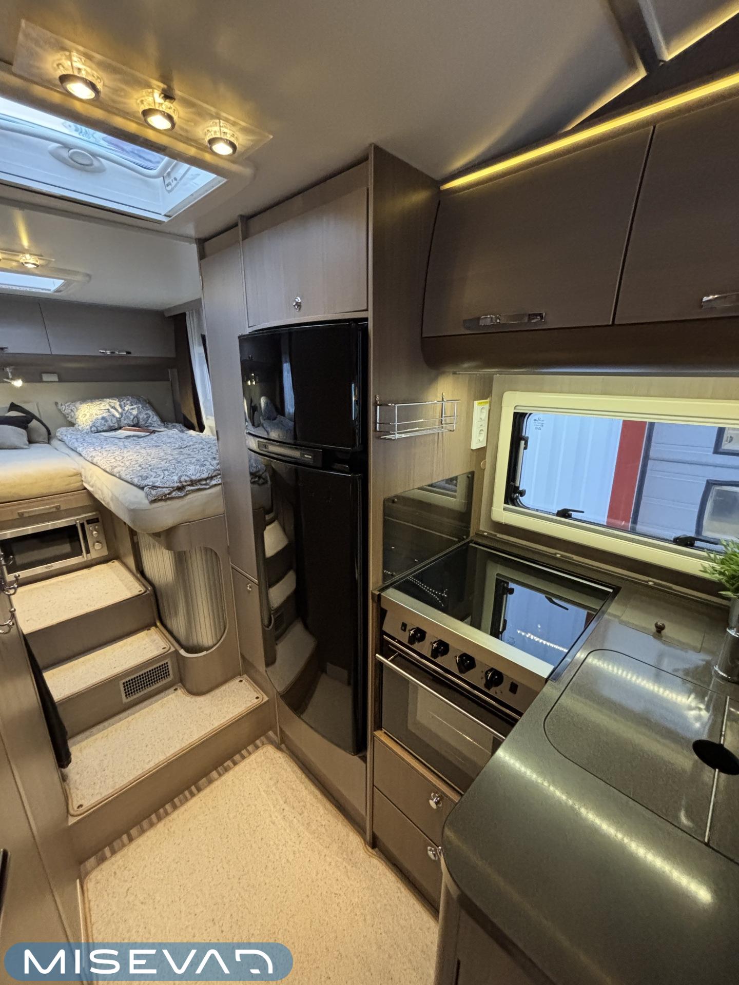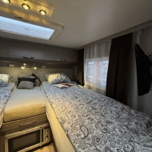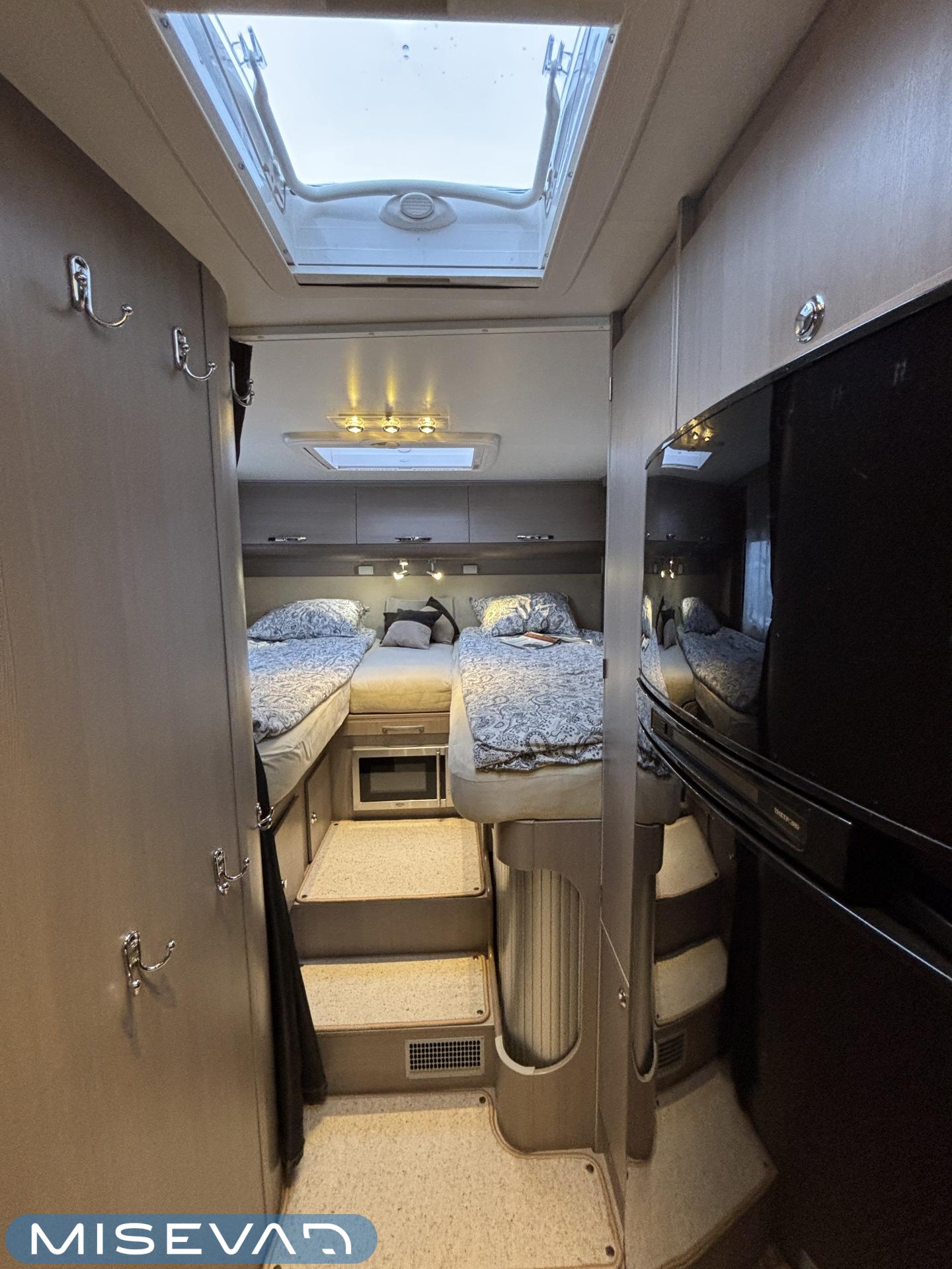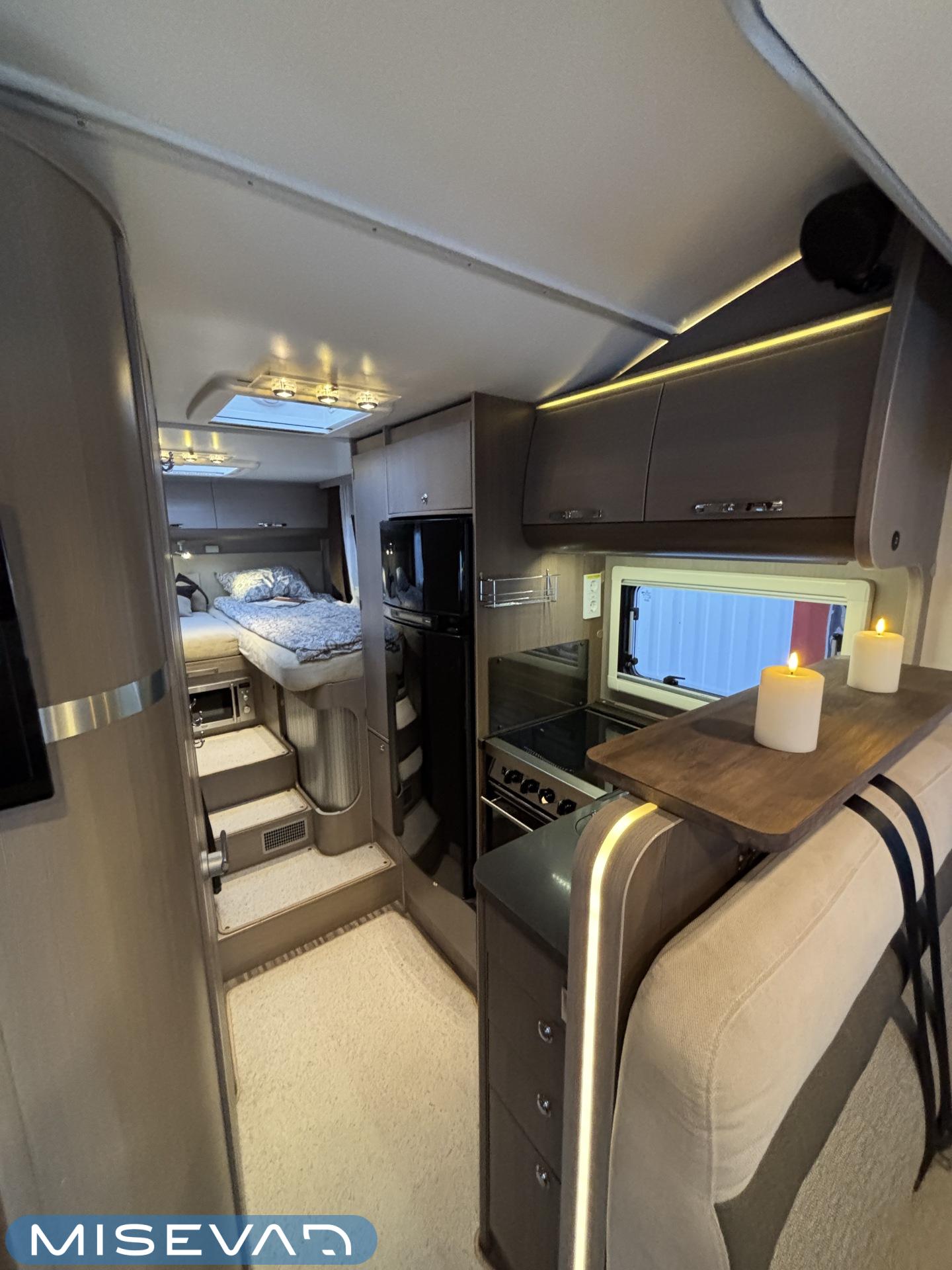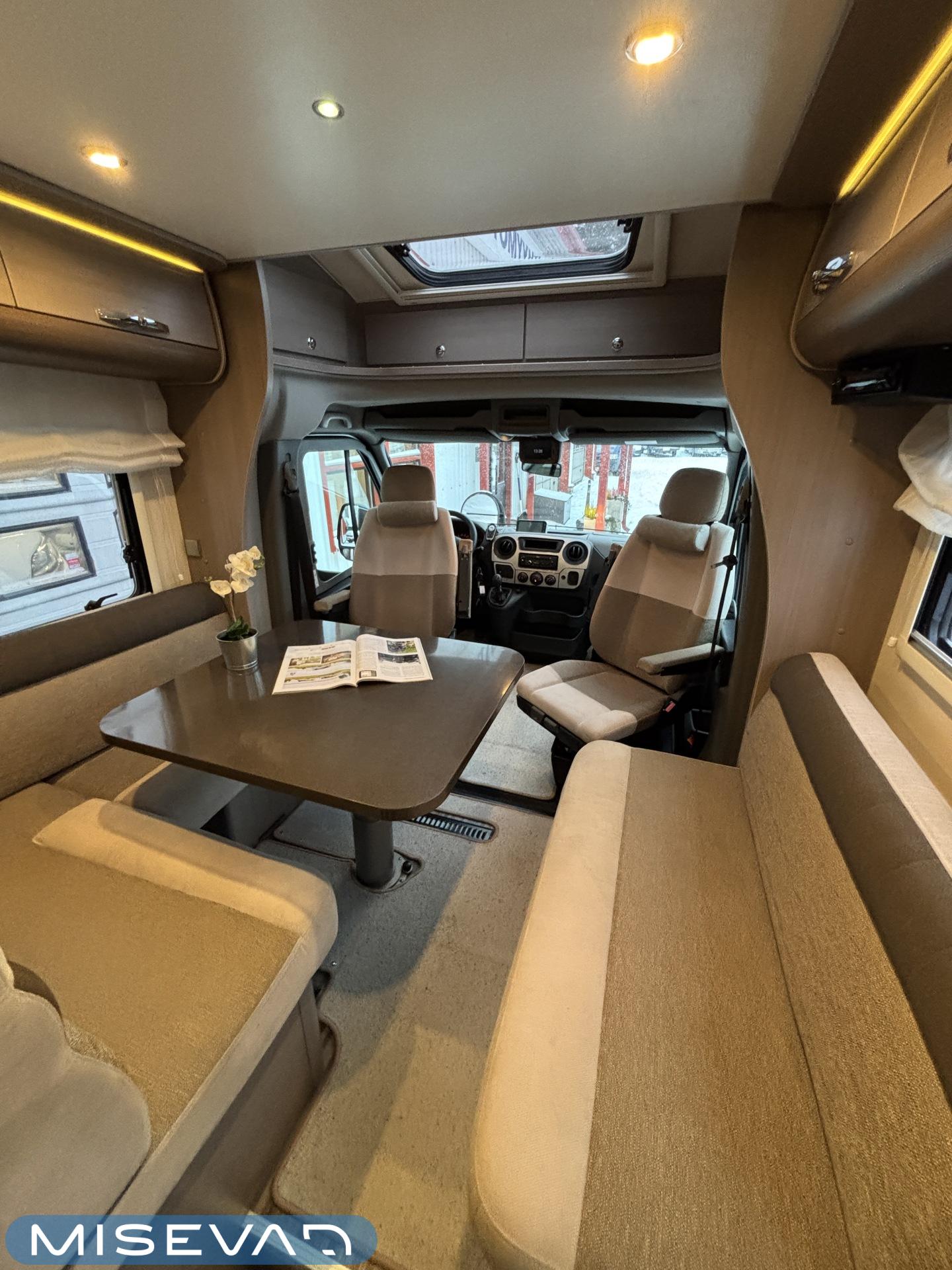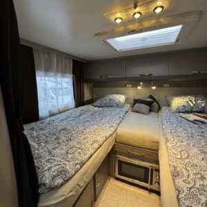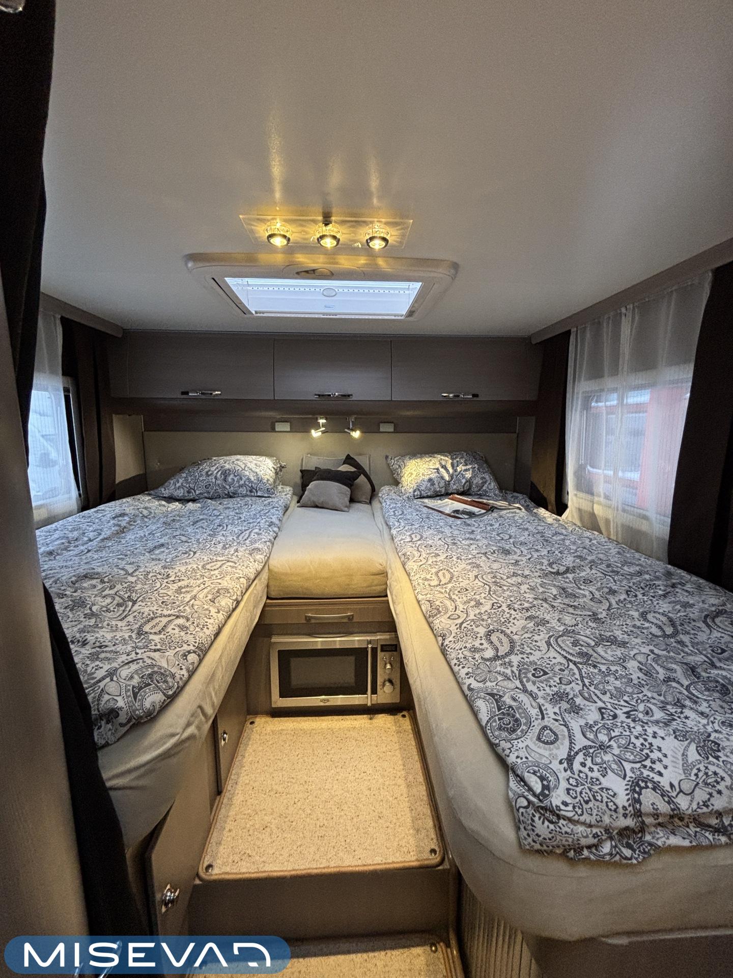Adrian Matrix Supreme mallisarjan puoli-integroitu matka-auto hillityllä ajomäärällä ja hillittömällä varustelulla. Vaikka tämä ”reiluhkon” kokoinen auto tarjoaa todella hulppeat tilat reissun päälle, niin tämä on silti ohjastettavissa ihan normaalilla B-luokan (henkilöauto) ajokortilla. Takaosassa on erillisvuoteet mitkä tarvittaessa pystyy yhdistämään lisäpalan avulla yhdeksi jättivuoteeksi. Kampetta mahtuu mukaan vuoteiden alle jäävään takatalliin ja osa säilytystiloista on operoitavissa myös auton sisäpuolelta. Keskelle autoa asettuu L-keittiö isolla jääkaapilla ja kaasu-uunilla varustettuna. Toiselta sivulta löytyy kylppäritilat missä on erillinen suihkutila. Etuosaa hallitsee L-sohva minne yhdistyvät kipparinpenkit, sekä kahden istuttava sivusohva. Pöytäryhmästä saadaan myös tarpeen tullen värkättyä lisävuode. Ryhmän yläpuollella on laskuvuode minne mahtuu nukkumaan kaksi henkilöä. Huomattavaa on, että vaikka laskuvuode on alhaalla, niin se ei hankaloita sisäänkäyntiä. Koko komeus lämpenee Alden nestekeskuslämmityksen avulla ja nestekierto on myös lattiassa. Järjestelmästä löytyy tietysti myös sähkövastukset, sekä lämmönvaihdin. Sähköpuolelle on ”hifistelty” lisäpotkua 140Ah AGM akun avulla, aurinkopaneelilla, sekä etäohjattavalla invertterillä. Valmiiksi asennettuna on myös markiisi, pyöräteline ja kaasun ulosotto. Alustan virkaa toimittaa 150 hevosvoimainen Renault Master ja jämäkkyyttä menoon on lisätty taka-akselilla olevilla lisäilmajousilla. Ohjaamossa tietysti ilmastointi, sähköllä lasit ja peilit, vakkari, navigaattori ja peruutuskamera. Varsin mallikkaan kunnon omaava auto. Tulehan tutustumaan ja ihastumaan.