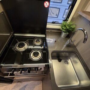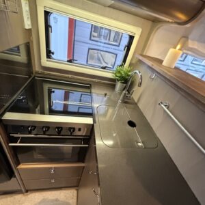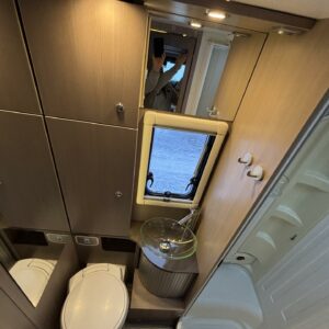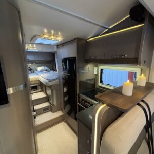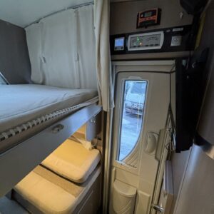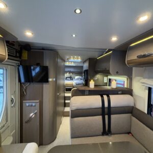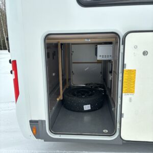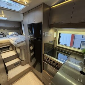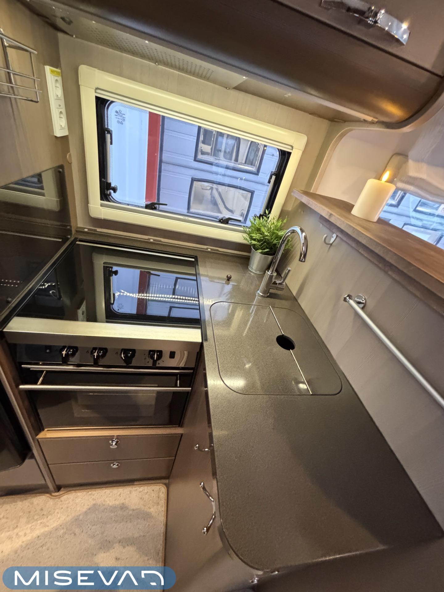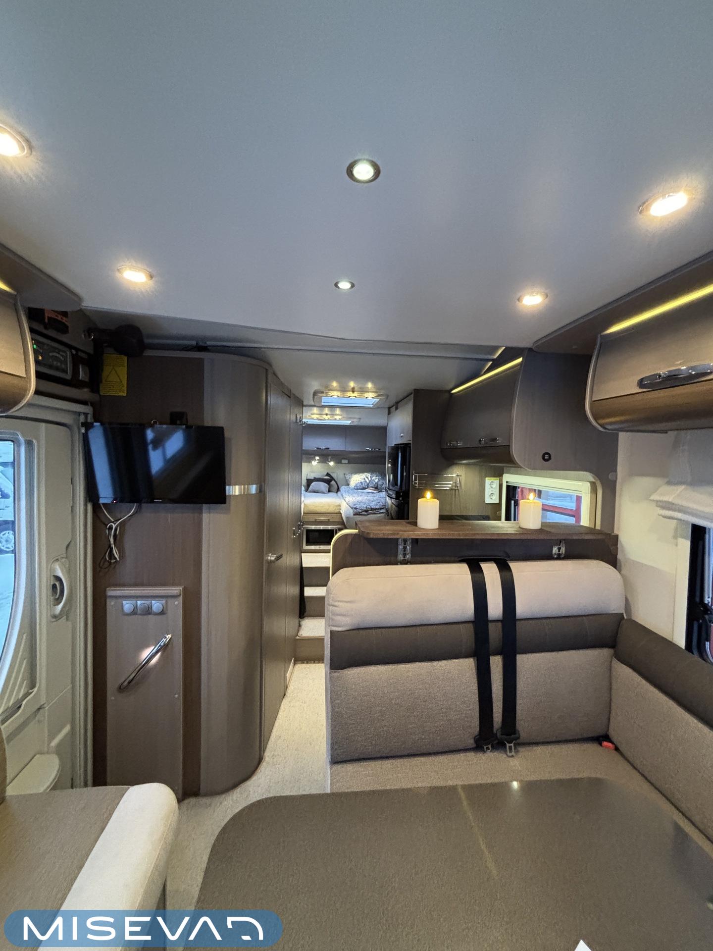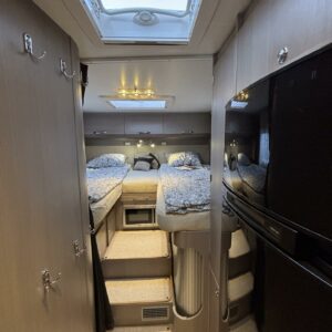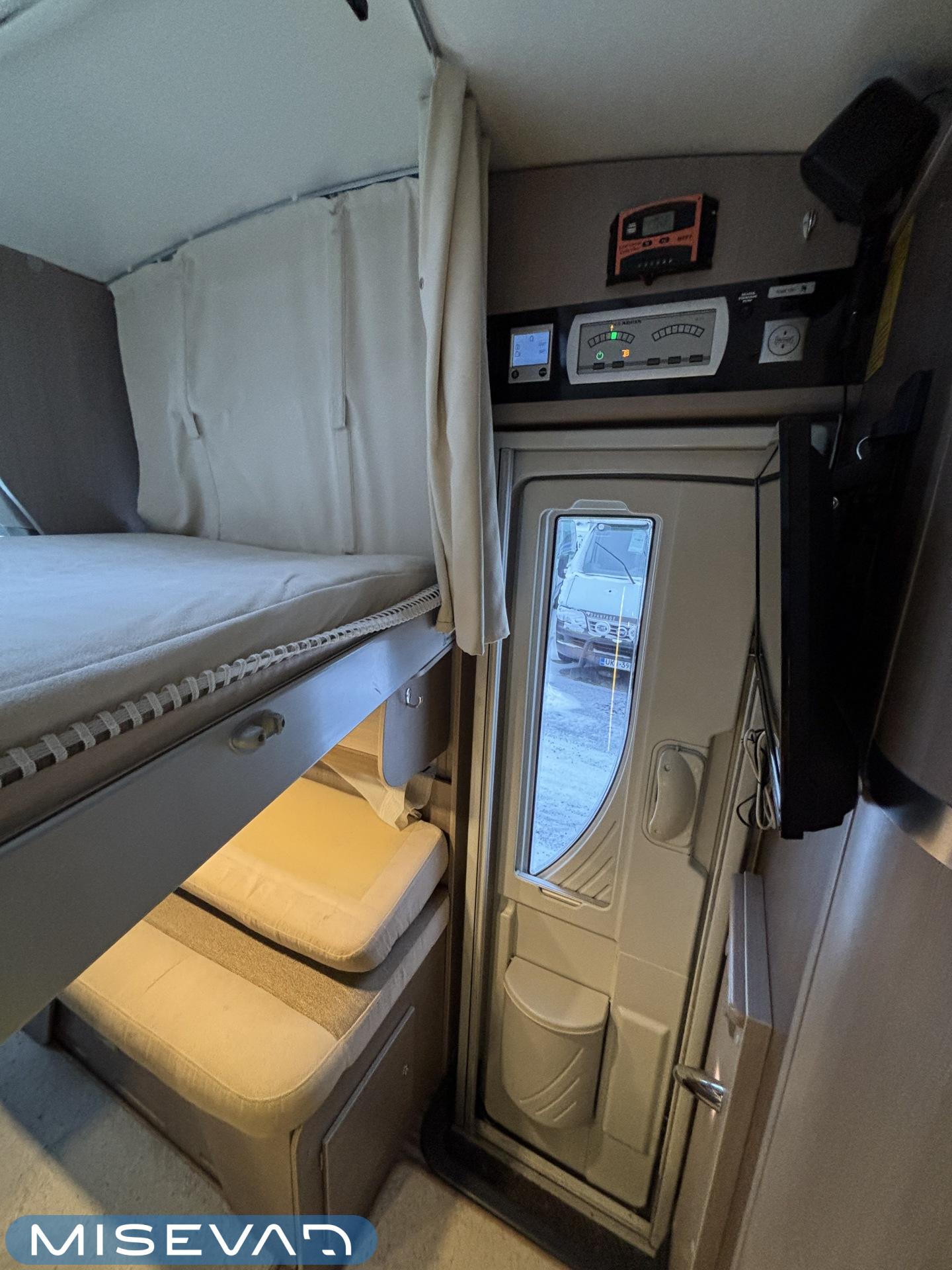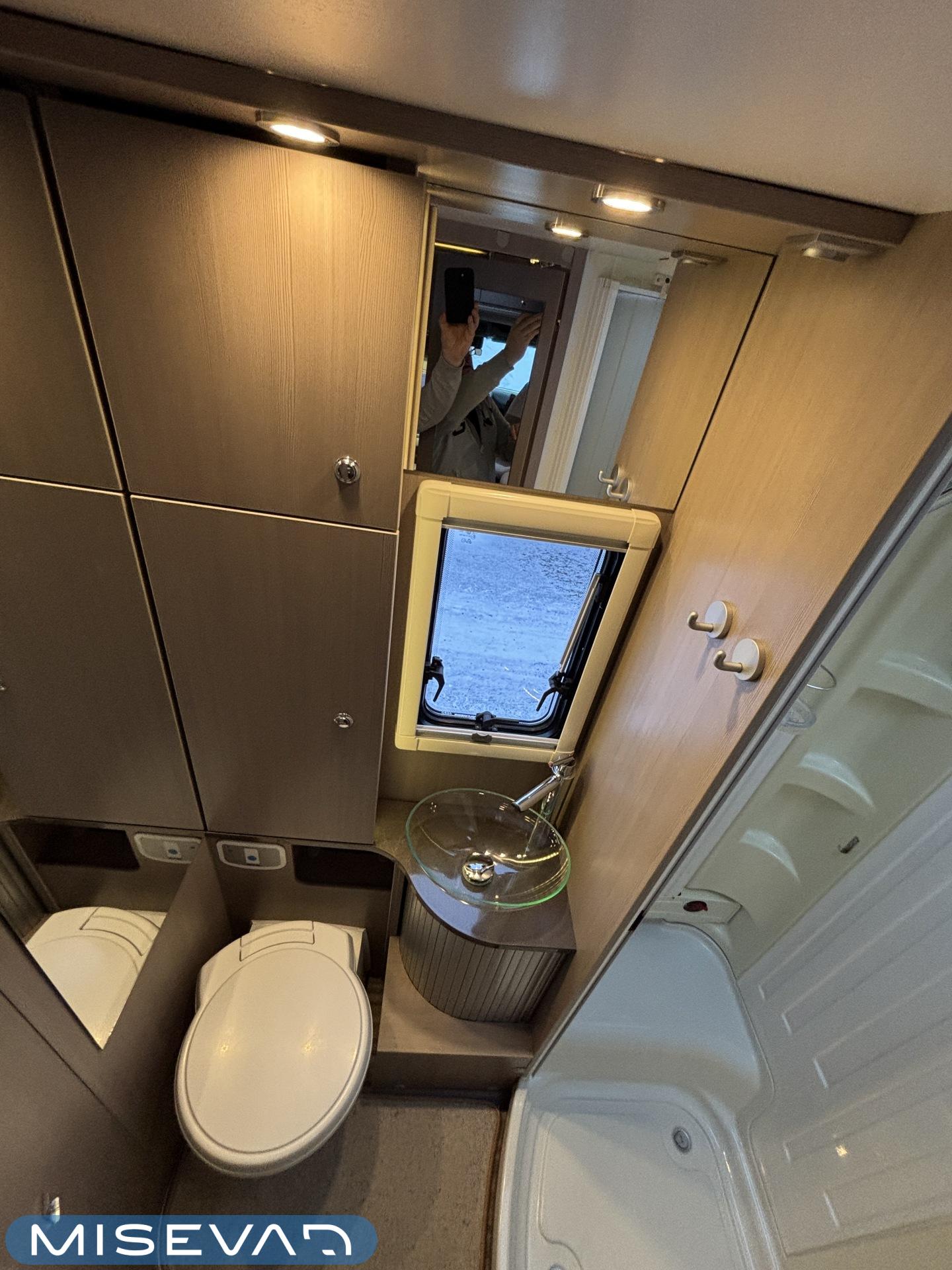 Adrian Matrix Supreme mallisarjan puoli-integroitu matka-auto hillityllä ajomäärällä ja hillittömällä varustelulla. Vaikka tämä ”reiluhkon” kokoinen auto tarjoaa todella hulppeat tilat reissun päälle, niin tämä on silti ohjastettavissa ihan normaalilla B-luokan (henkilöauto) ajokortilla. Takaosassa on erillisvuoteet mitkä tarvittaessa pystyy yhdistämään lisäpalan avulla yhdeksi jättivuoteeksi. Kampetta mahtuu mukaan vuoteiden alle jäävään takatalliin ja osa säilytystiloista on operoitavissa myös auton sisäpuolelta. Keskelle autoa asettuu L-keittiö isolla jääkaapilla ja kaasu-uunilla varustettuna. Toiselta sivulta löytyy kylppäritilat missä on erillinen suihkutila. Etuosaa hallitsee L-sohva minne yhdistyvät kipparinpenkit, sekä kahden istuttava sivusohva. Pöytäryhmästä saadaan myös tarpeen tullen värkättyä lisävuode. Ryhmän yläpuollella on laskuvuode minne mahtuu nukkumaan kaksi henkilöä. Huomattavaa on, että vaikka laskuvuode on alhaalla, niin se ei hankaloita sisäänkäyntiä. Koko komeus lämpenee Alden nestekeskuslämmityksen avulla ja nestekierto on myös lattiassa. Järjestelmästä löytyy tietysti myös sähkövastukset, sekä lämmönvaihdin. Sähköpuolelle on ”hifistelty” lisäpotkua 140Ah AGM akun avulla, aurinkopaneelilla, sekä etäohjattavalla invertterillä. Valmiiksi asennettuna on myös markiisi, pyöräteline ja kaasun ulosotto. Alustan virkaa toimittaa 150 hevosvoimainen Renault Master ja jämäkkyyttä menoon on lisätty taka-akselilla olevilla lisäilmajousilla. Ohjaamossa tietysti ilmastointi, sähköllä lasit ja peilit, vakkari, navigaattori ja peruutuskamera. Varsin mallikkaan kunnon omaava auto. Tulehan tutustumaan ja ihastumaan.