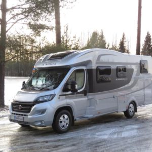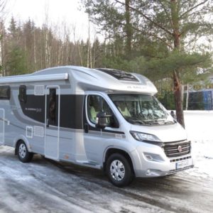 Varusteina mm: Ilmastointi ohjaamossa, Truma- keskuslämmitys sähköpatruunalla, Lattialämmitys, Iso jääkaappi- pakastin, Markiisi,..