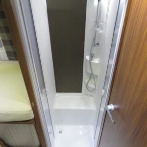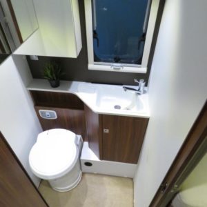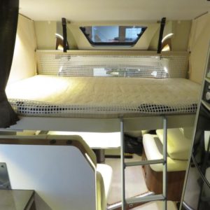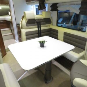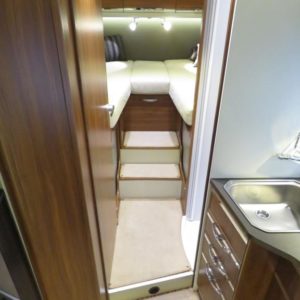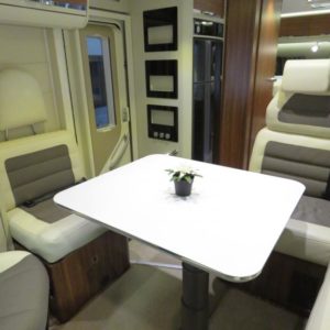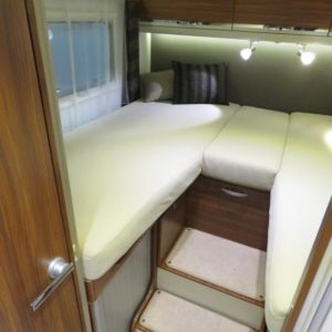 Auton takaosassa mukavat erillisvuoteet, edessä viihtyisä pöytäryhmä sivusohvalla ja leveä sähköinen laskuvuode. Auton keskiosasta löytyy erillinen suihku ja WC. Takavuoteiden alla tilava talli.