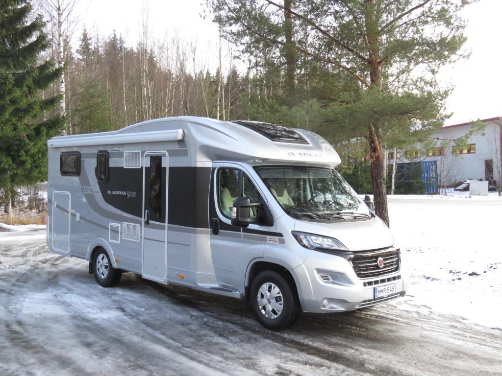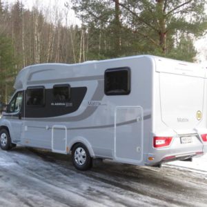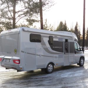 Varusteina mm: Ilmastointi ohjaamossa, Truma- keskuslämmitys sähköpatruunalla, Lattialämmitys, Iso jääkaappi- pakastin, Markiisi,..