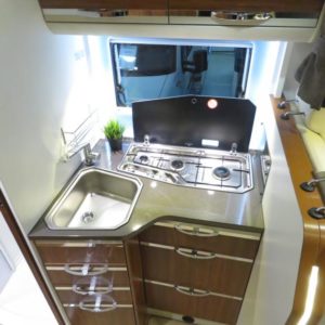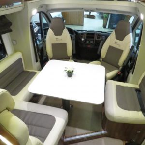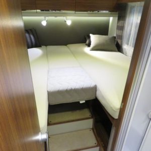 Auton takaosassa mukavat erillisvuoteet, edessä viihtyisä pöytäryhmä sivusohvalla ja leveä sähköinen laskuvuode. Auton keskiosasta löytyy erillinen suihku ja WC. Takavuoteiden alla tilava talli.