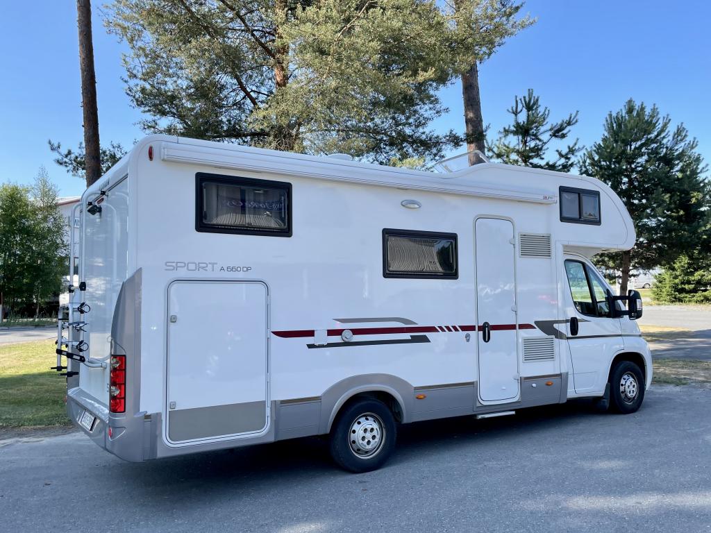Varusteena mm; Trumatic- lämmitysjärjestelmä, Markiisi, Vakionopeudensäädin, Polttoainekäyttöinen lisälämmitin, Pyöräteline,..
