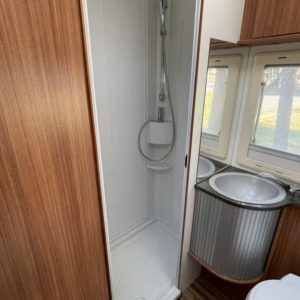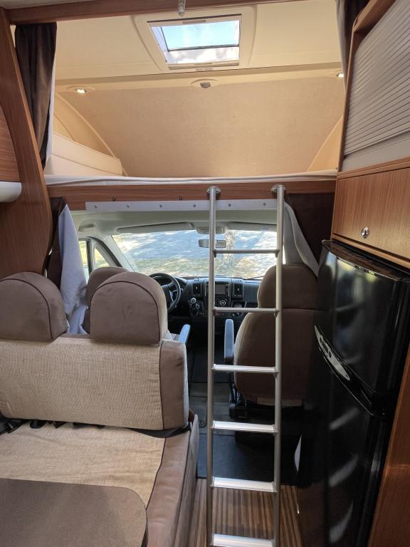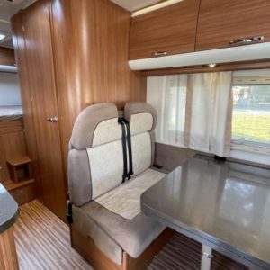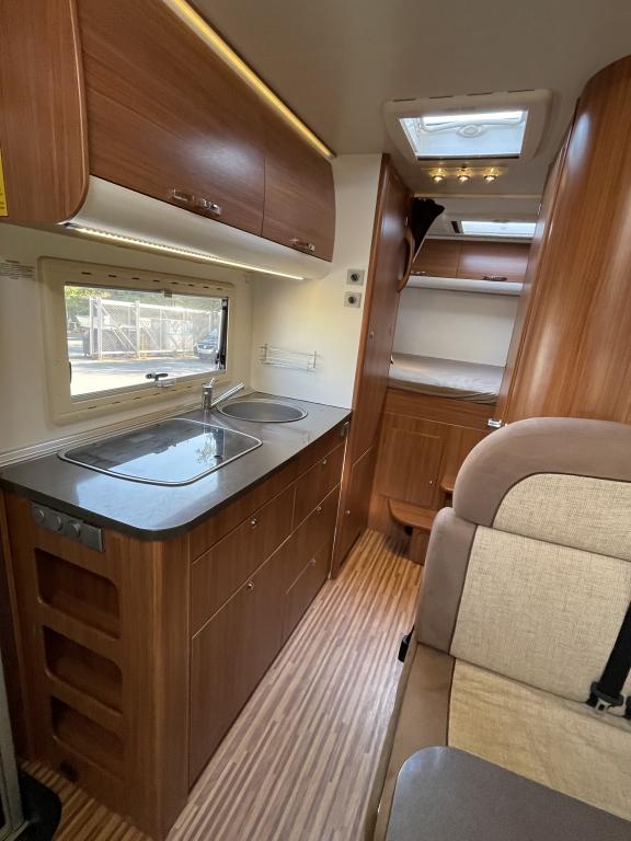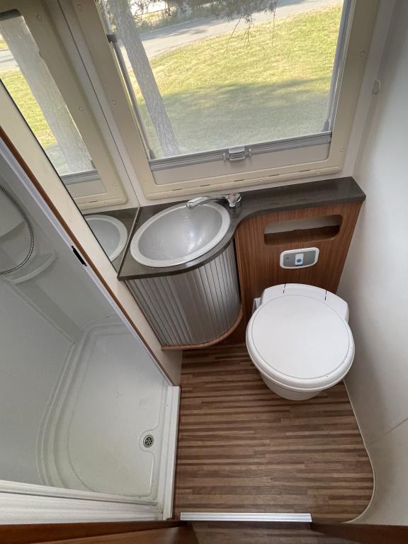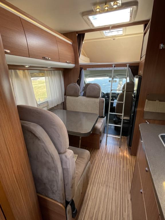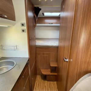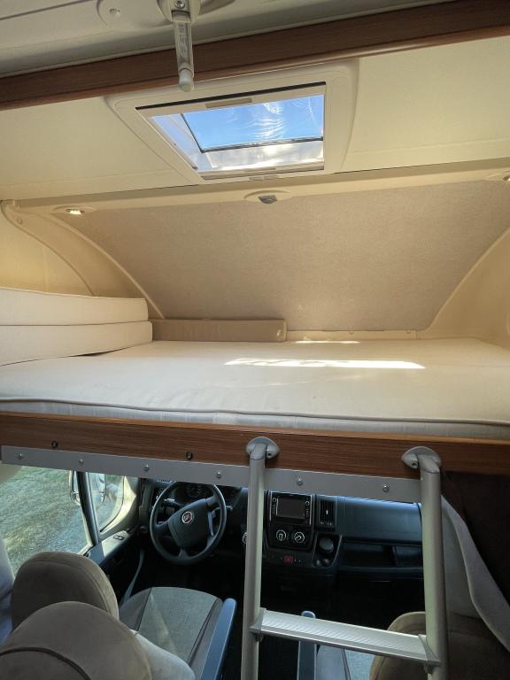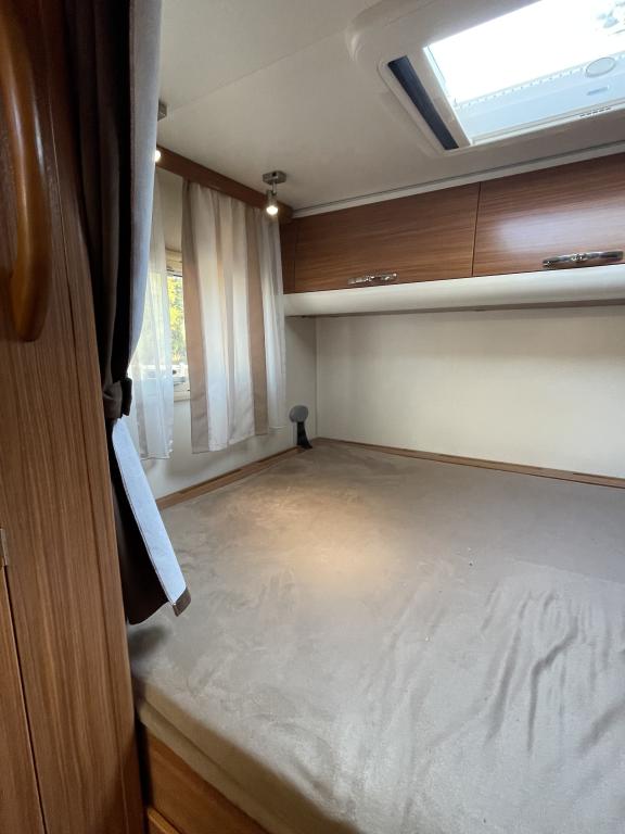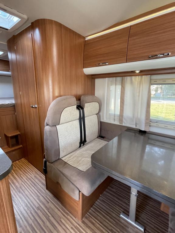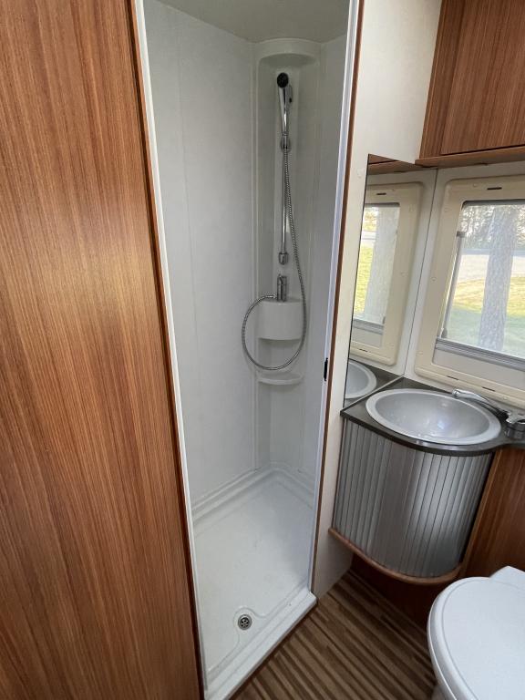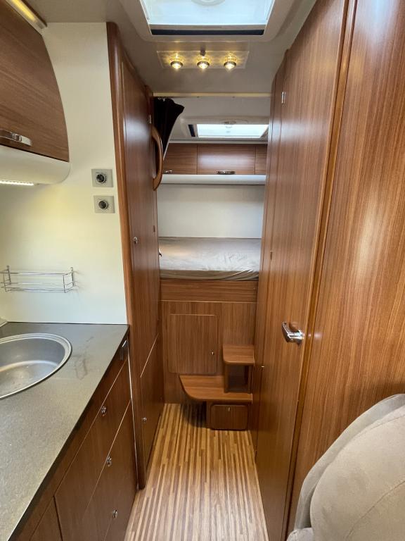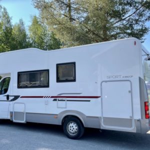 Pohjaratkaisussa edessä alkovivuode, sohvaryhmä sekä reilunkokoinen jääkaappipakastin- yhdistelmä. Keskiosassa keittiö sekä Wc & Suihkutila. Takaosassa poikittainen parivuode jonka korkeutta pystyy säätämään vuoteen alta löytyvästä suuresta takatallista.