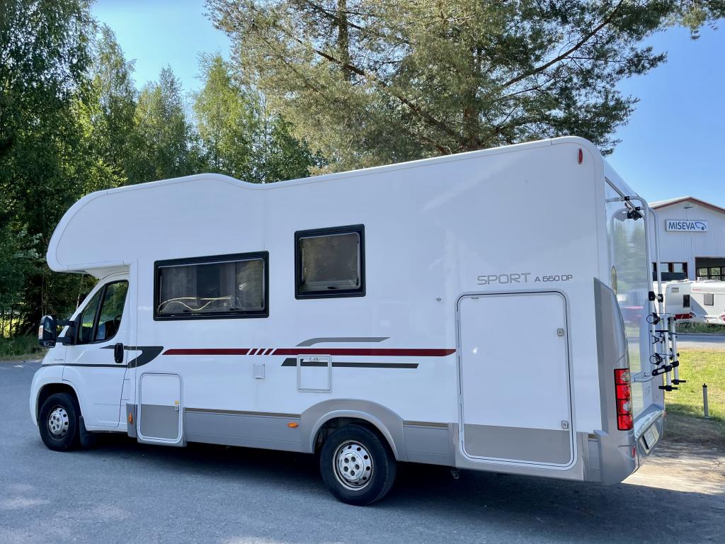 Varusteena mm; Trumatic- lämmitysjärjestelmä, Markiisi, Vakionopeudensäädin, Polttoainekäyttöinen lisälämmitin, Pyöräteline,..
