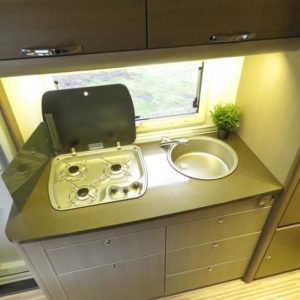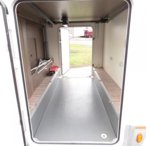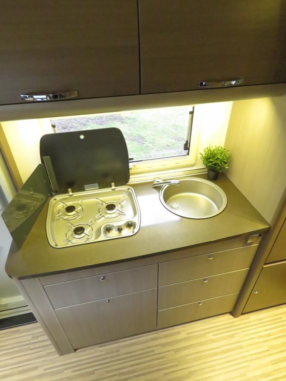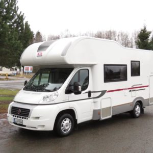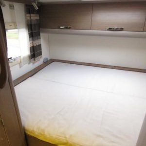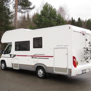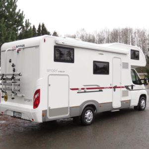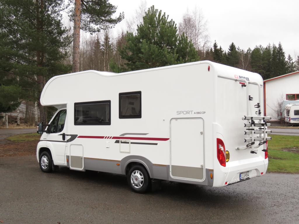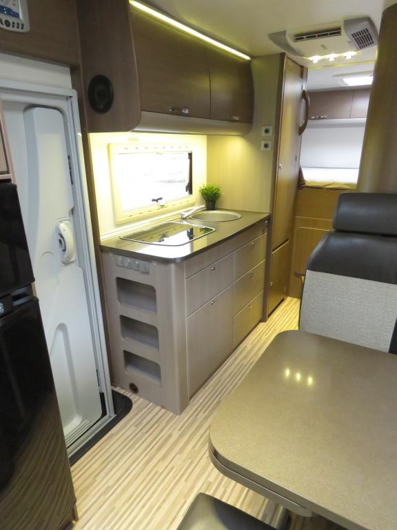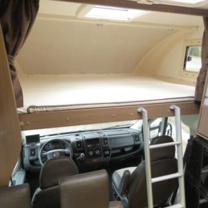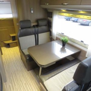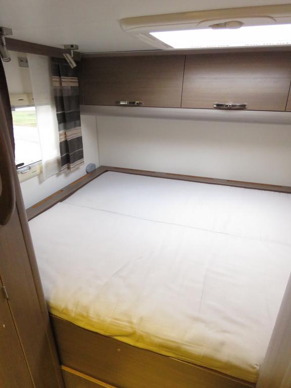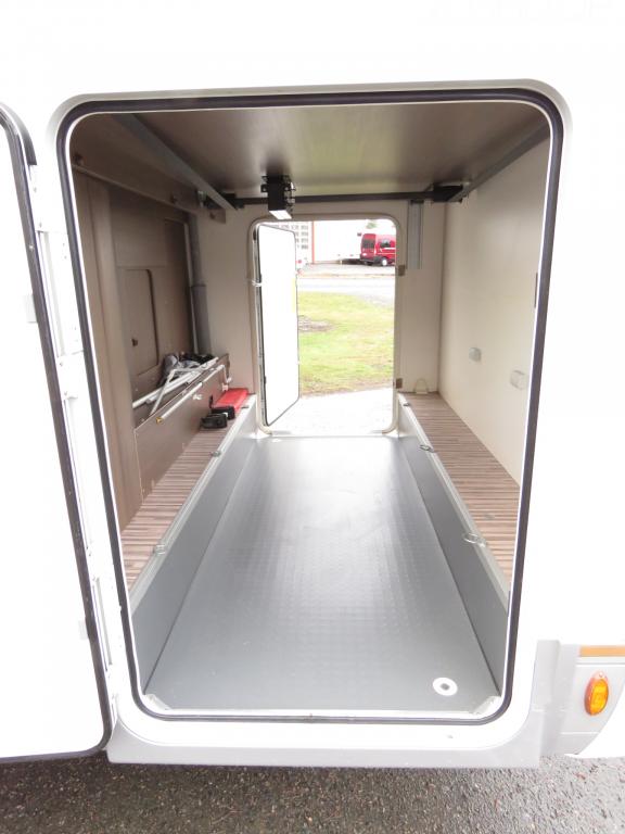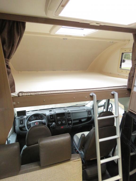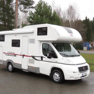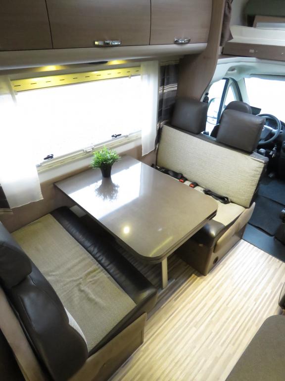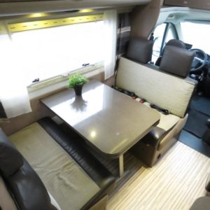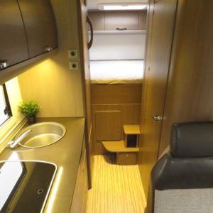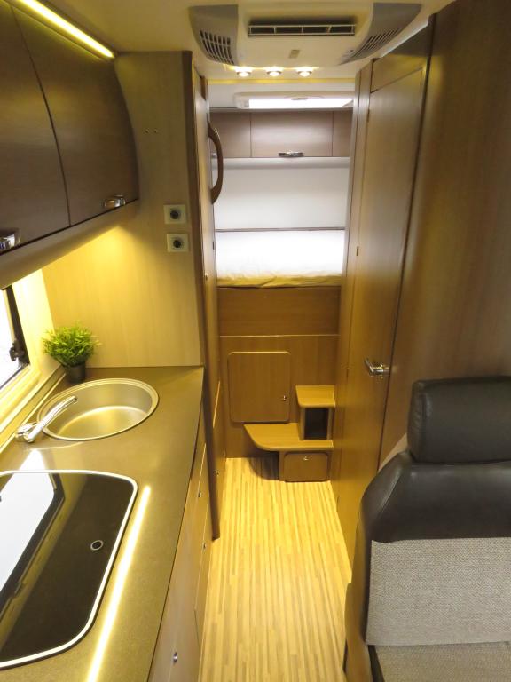 Auton takaosassa leveä parivuode jonka alla tilava talli. Edessä valoisa pöytäryhmä ja toinen kiinteä parivuode alkovissa. Lisäksi keittiö isolla jääkaapilla ja pesuhuone erillisellä suihkunurkkauksella.