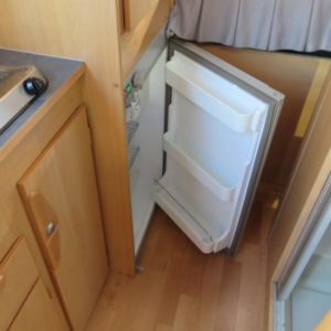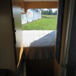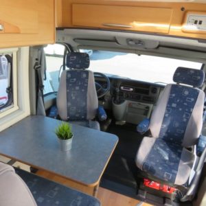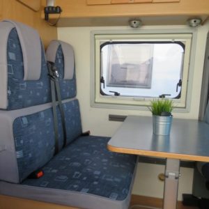 Auton takaosassa parivuode jonka alla runsaasti säilytystilaa, edessä pöytäryhmä neljälle.