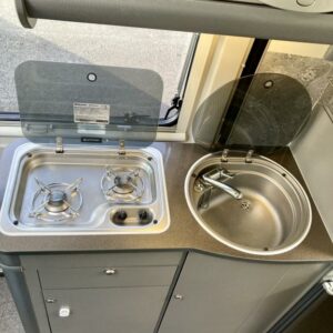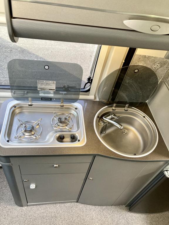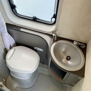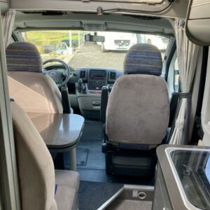 Pohjaratkaisussa edessä sohvaryhmä ja kääntyvät etuistuimet. Keskiosassa keittiö sekä wc -ja suihkutila. Takaosassa poikittainen parivuode.
