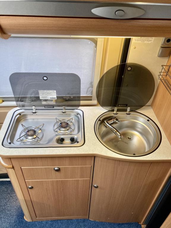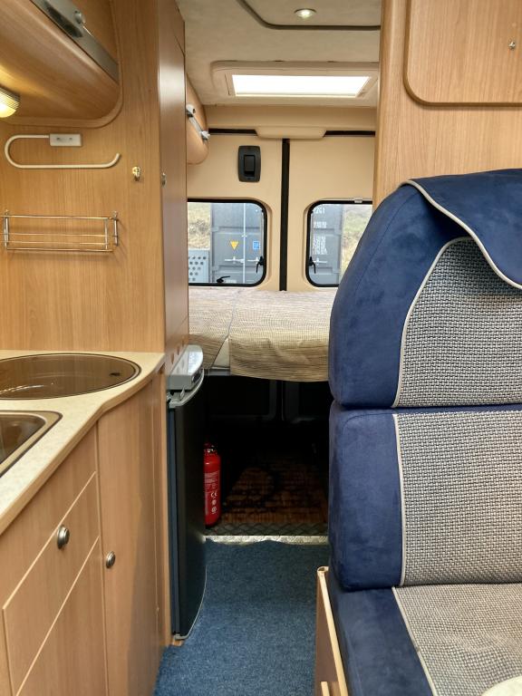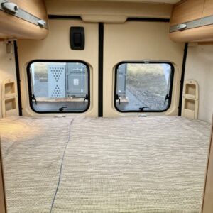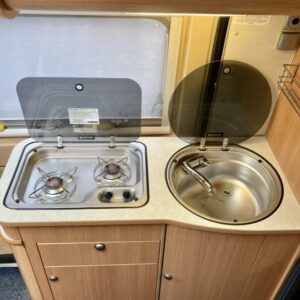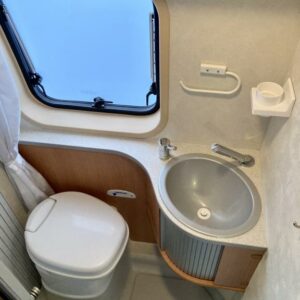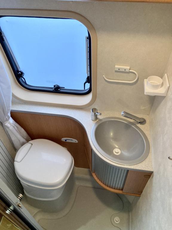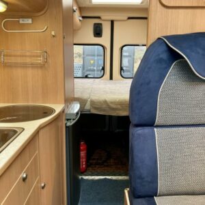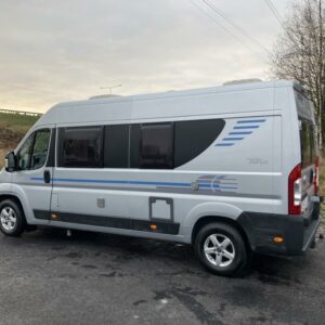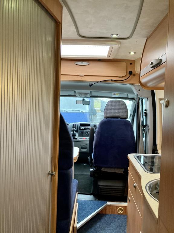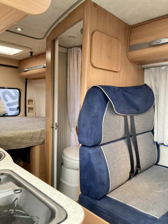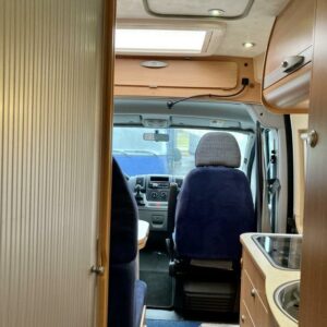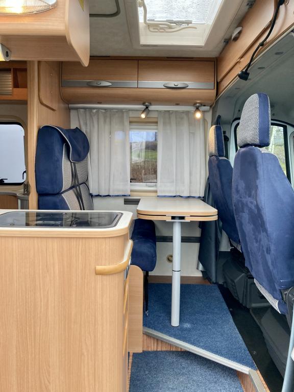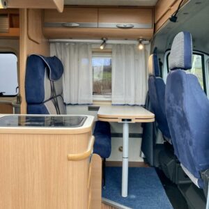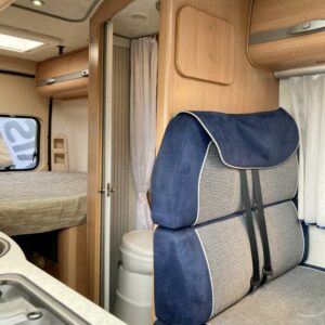 Pohjaratkaisussa edessä sohvaryhmä ja kääntyvät etuistuimet. Keskiosassa keittiö sekä wc -ja suihkutila. takaosassa poikittainen parivuode sekä kaappitilaa.