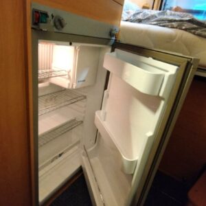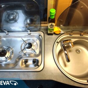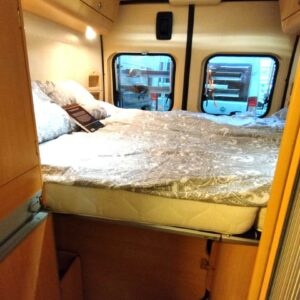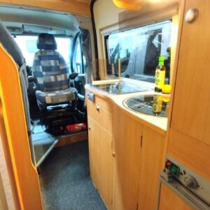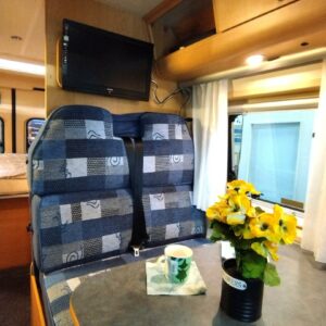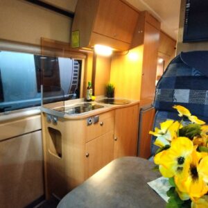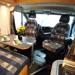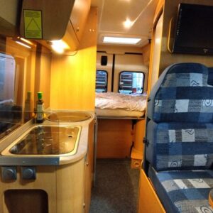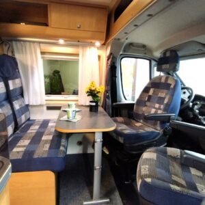 Edessä pöytäryhmä minne saadaan istumapaikat neljälle (etupenkit kääntyvät osaksi pöytäryhmää). Pöytäryhmästä saa sijattua myös nukkumapaikan yhdelle henkilölle. Keskellä keittiö normaalilla keittövarustuksella. Takana poikittainen parivuode minkä alapuolella hyvin säilytystilaa isommille tavaroille.