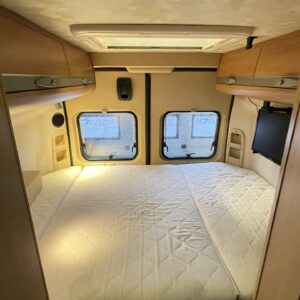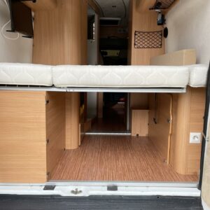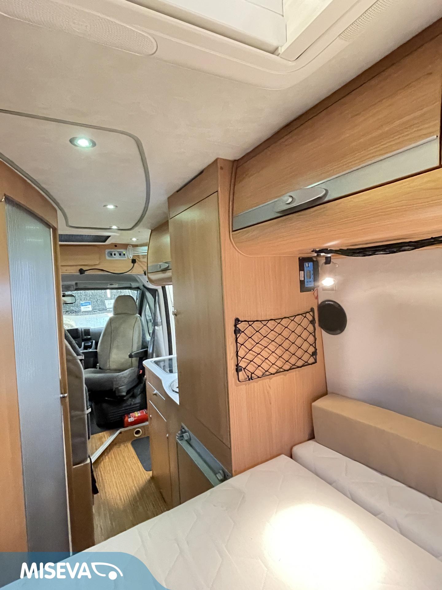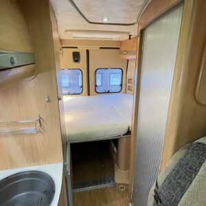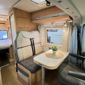 Takana parivuode ja alla hyvä tavaratila, keskellä keittiö ja pesuhuone, edessä istuinryhmä 4:lle kääntyvin ohjaamon penkein.