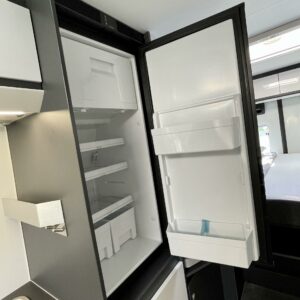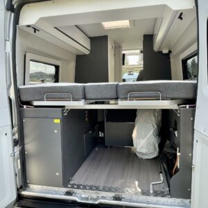 Auton perällä on muhkean kokoinen nukkumatila, missä vuoteet muuttuvat tarpeen mukaan joko erillisiksi vuoteiksi tai pitkittäiseksi parisängyksi.