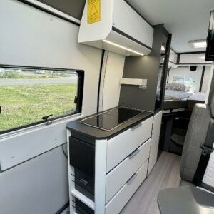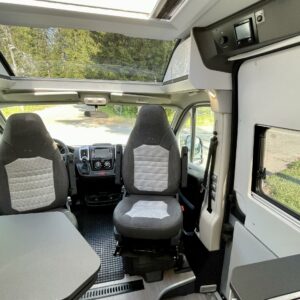Auton etuosassa istuinryhmä kääntyvine etupenkkeineen, yhdistettynä monikäyttöiseen pöytään, kutsuu rauhoittumaan lasillisen ääreen pitkän päivän päätteeksi.