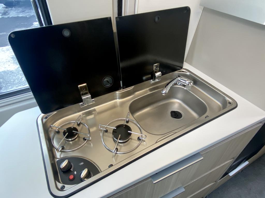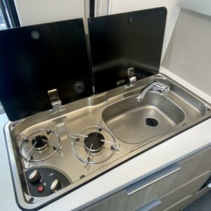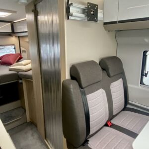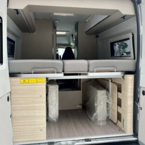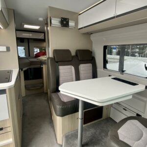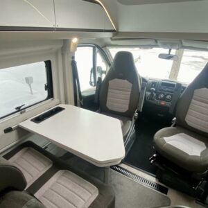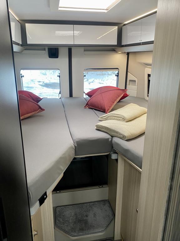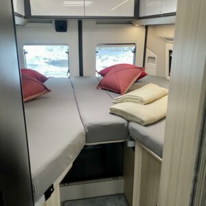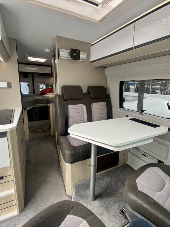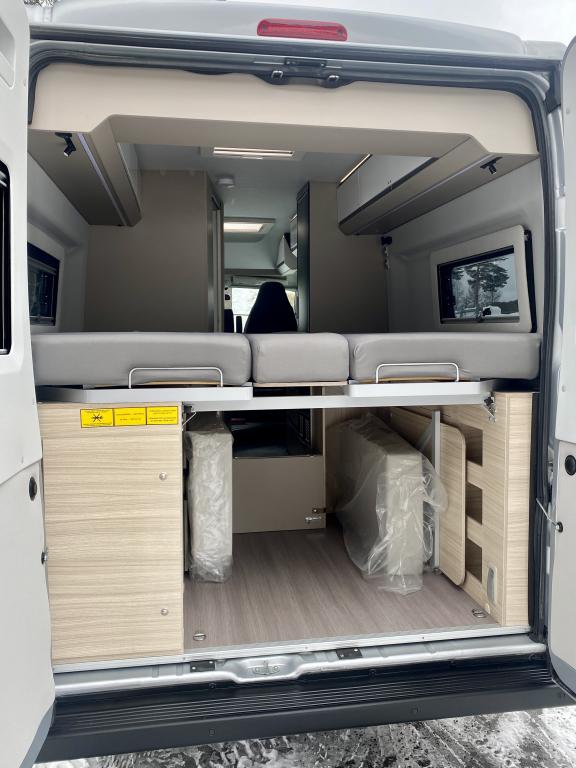 Auton takaosassa pitkittäiset erillisvuoteet ja iso tavaratila, edessä valoisa ja viihtyisä pöytäryhmä neljälle. Pöytäryhmästä sijattavissa lisävuode erillisen lisävuodesarjan avulla.