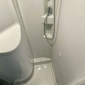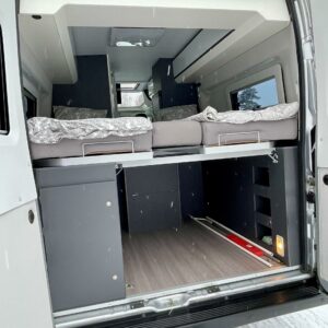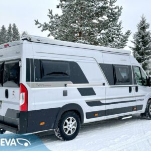 Auton takaosassa on pitkittäiset erillisvuoteet ja iso tavaratila. Pesuhuone/ WC:ssä on tilaa säästävä kääntöseinä.