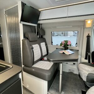 Auton etuosassa on panoraamaikkunan ja ison kattoluukun kautta tulevassa valossa kylpevä pöytäryhmä. Pöytäryhmästä saa mukana tulevan patjasarjan avulla tehtyä tilapäisvuoteen.