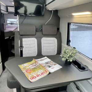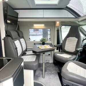 Auton etuosasta löytyy ison kattoluukun ja panoraamakaton antamassa valossa kylpevä pöytäryhmä neljälle.