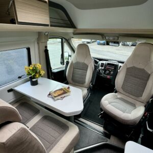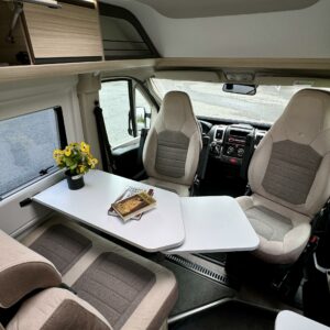 Auton etuosassa on viihtyisä istuinryhmä neljälle.