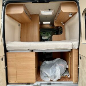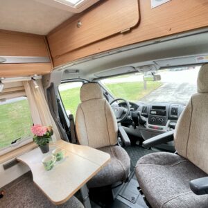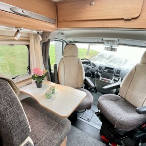 Takana poikittainen parivuode minkä alle jää hyvin säiltystilaa. Keskellä autoa sijaitseen keittö ja toisella puolella WC/kylpyhuonetilat. Auton etuosassa on pöytäryhmä minne yhdistyvät kääntyvät ohjaamon penkit.