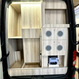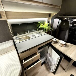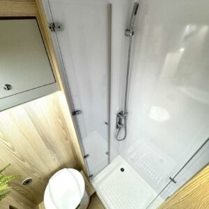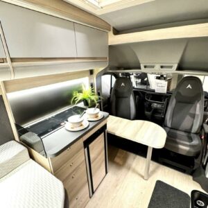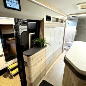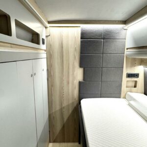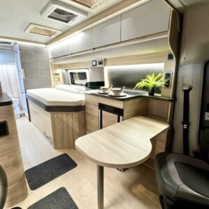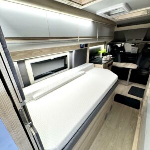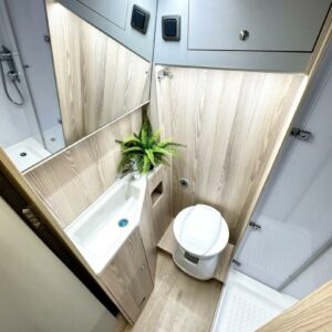 Käytännölliset tilaratkaisut: Keskellä autoa sijaitsee leveä parivuode ja takana tilava kylpyhuone, jossa on erillinen tilava suihkukaappi, ja joka lisää mukavuutta etenkin pidemmillä matkoilla.