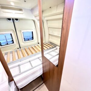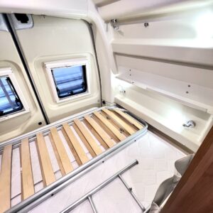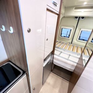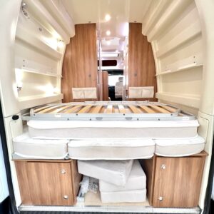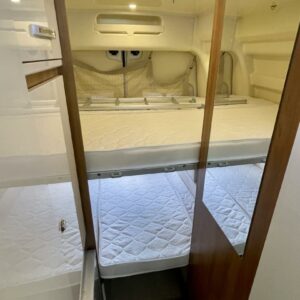 Pohjaratkaisussa edessä tilava pöytäryhmä neljälle. Keskiosassa keittiö sekä WC -& suihkutila. Takaosassa parivuoteet kahdessa kerroksessa.