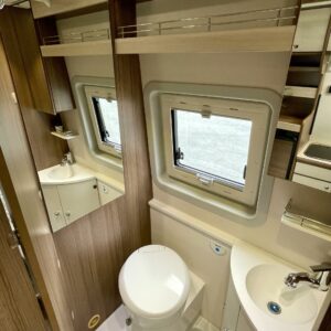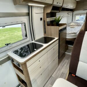 Erillisvuoteinen retkis herkku! Tämän retkiksen perältä löytyy suorastaan oma makuuhuone. Välipalalla erillissängyt saa yhdeksi isoksi kokonaisuudeksi, johon mahtuu vaikka kolmekin vierekkäin. Luxusta! Jääkaappi on hieman normaalia isompi ja keittiöstä löytyy kätevät vetolaatikostot. WC:ssä on myös suihkumahdollisuus. Kaapistoja piisaa pitkin auton yläosaa ja sängyn alla on lisää säilytystilaa. Kaikenkaikkiaan tyylikäs kokonaisuus. Ihan kuin hotellihuone olisi saatu pakettiauton sisälle.