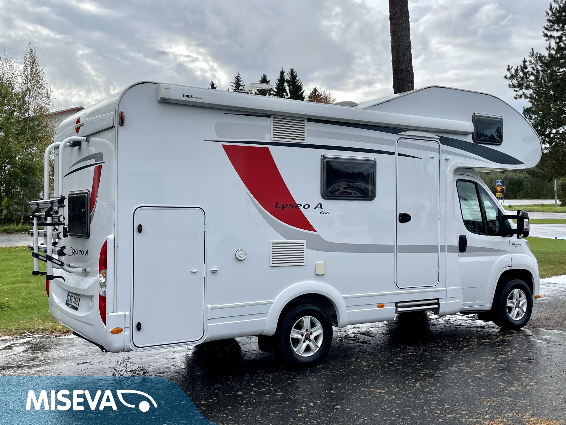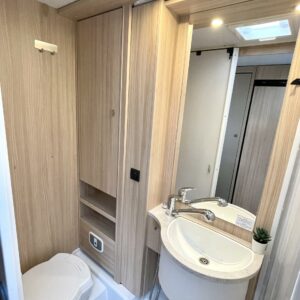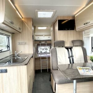 Jos meidän autoja sanotaan siistiksi, niin tämä on kyllä supersiisti. Valoisa ja avara perhematkailuauto kuudelle yöpymiseen. Kerrosvuoteet takana ovat omassa rauhassa ja tarvittaessa alasängyn saa myös nostettua ylös, jolloin takatallin tila kasvaa. WC- ja suihkutilassa jatkuu sisustan tyylikkyys ja kaappitilaa löytyy hammasmukeille ja vanulapuille. Keittiössä kaappitilaa on samoiten ja isoon jääkaappiin mahtuu kaikkien eväät. Ruokaryhmästä saa tarvittaessa sängyn ja turvavyöthän löytyy tästä kaikille matkustajille. Alkovista os suorastaan ruhtinaallinen tila siellä nukkuville. Tästä huippu siisti matkakumppani.