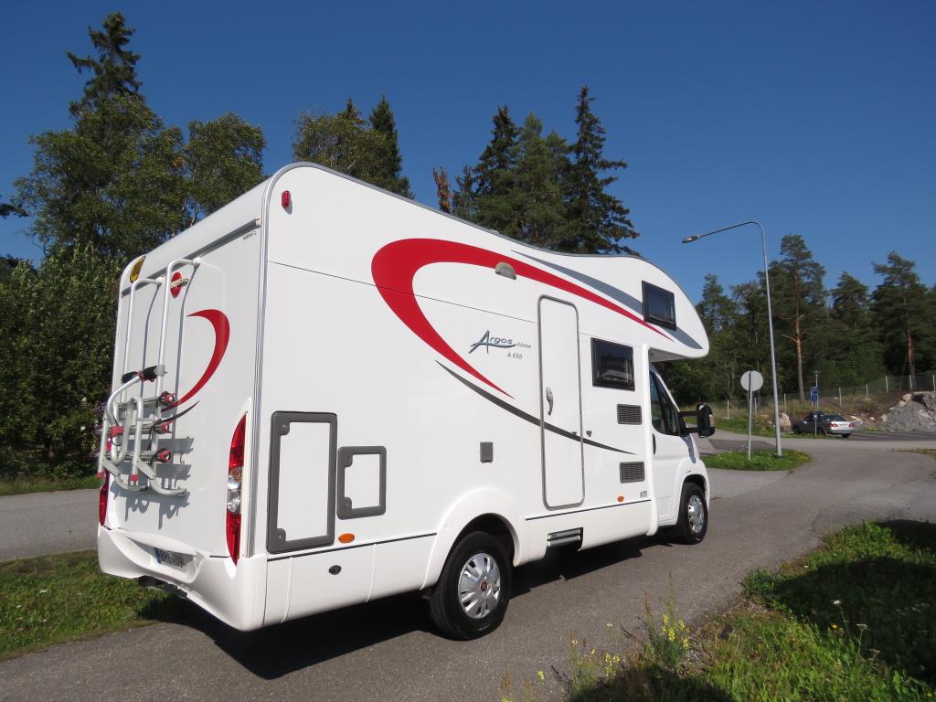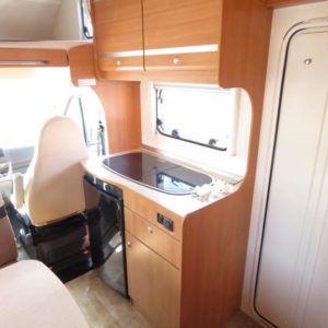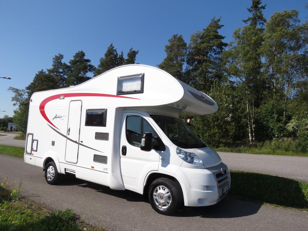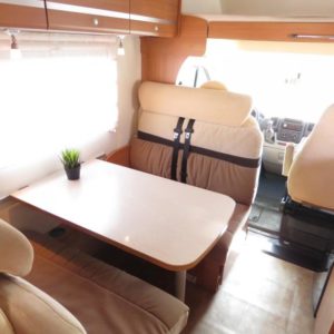 Alkovin kääntöpohja tuo lisää tilaa ohjaamoon, etupäässä neljän istuttava pöytäryhmä ja keittiö, takana parivuode,wc ja vaatekaappi. Toimiva pohjaratkaisu.
