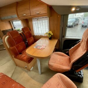 Viihtyisä ja avara pohjaratkaisu: Auton etuosassa on pöytäryhmä, jonka ympärille mahtuu kääntyvien etuistuinten ja sivusohvan ansiosta jopa kuusi henkeä. Ohjaamon päälle laskeutuva nostovuode tuo lisää vuodepaikkoja käden käänteessä.