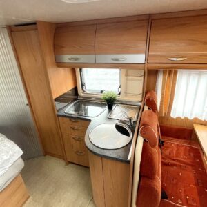 Auton peräosassa on pitkittäinen parivuode ja mukavan avara pesuhuone/ WC. L- keittiö isolla jääkaappi- pakastimella varustettuna on keskellä autoa.