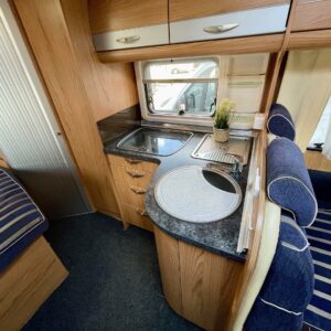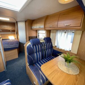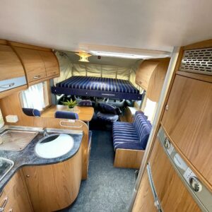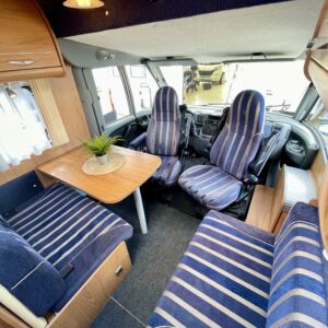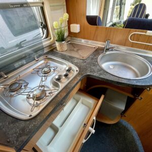 Auton keskiosassa on hyvin suunniteltu keittiö, jossa kokkailu sujuu vaivattomasti. Jääkaappi pakastimella on sijoitettu ergonomisesti hyvälle korkeudelle. Viihtyisä istuinryhmä toimii erinomaisesti ruokailuun ja yhdessäoloon, ja markiisi mahdollistaa ulkona oleskelun säällä kuin säällä, tarjoten suojaa niin auringolta kuin sateeltakin.