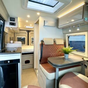 Lämmityksestä vastaa dieselkäyttöinen Truma- puhallinlämmitys. Ei keskellä yötä tyhjeneviä kaasupulloja! Kaasua käytetään ainoastaan keittiössä kaksipolttimisella liedellä, sillä jääkaappi on kompressorikäyttöinen ja akkutoiminen.