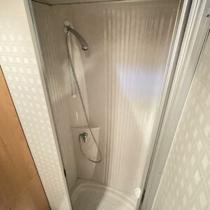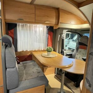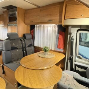 Edessä istuinryhmä 4:lle kääntyvin ohjaamon penkein. Takana matala parivuode pitkittäin ja vieressä avara pesuhuone, keskellä keittiö isolla jääkaapilla ja uunilla.