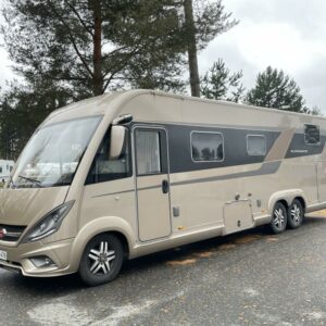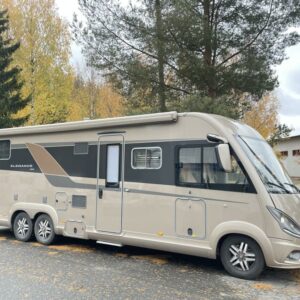 Varusteisiin kuuluu mm. Alde nestekeskuslämmitys, markiisi, 2 x ilmastointi, kesä – ja talvirenkaat ym..