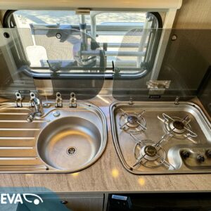 Auton takaoasasta löytyy runsaasti laskutilaa tarjoava keittiö ja tilava pesuhuone/ WC.