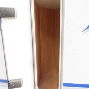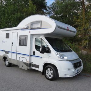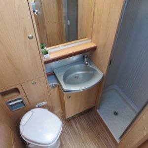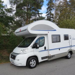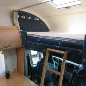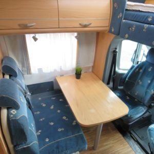 Takana iso pesuhuone vaatekomerolla,keskellä keittiö isolla jääkaapilla ja edessä istuinryhmä 6:lle kääntyvin ohjaamon penkein josta parivuode ja ohjaamon päällä tilava ja valoisa alkovivuode.