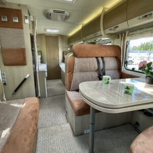 Auton etuosasta löytyy todella tyylikäs pöytäryhmä johon valoa tuo ikkunoiden lisäksi iso kattoluukku. Auton keskivaiheilta löytyy kivasti laskutilaa tarjoava keittiösaareke. Keittiön varustukseen kuuluu iso jääkaappi- pakastin, johon mahtuu evästä pidemmänkin retken tarpeisiin. Takaosasta löytyy mukavien erillisvuoteiden lisäksi todella toimivat WC-/ pesutilat erillsellä suihkunurkkauksella.