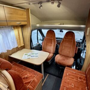 Auton etuosassa on viihtyisä ja valosa pöytäryhmä. Kääntyvien etuistuinten ja sivusohvan ansiosta pöydän ympärille mahtuu mukavasti kuusi henkeä ajatuksia vaihtamaan.
