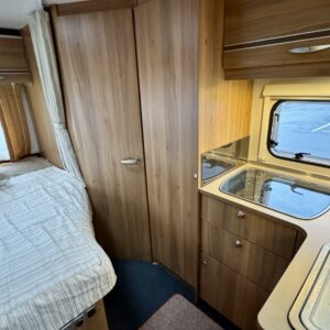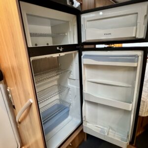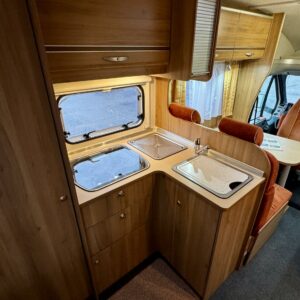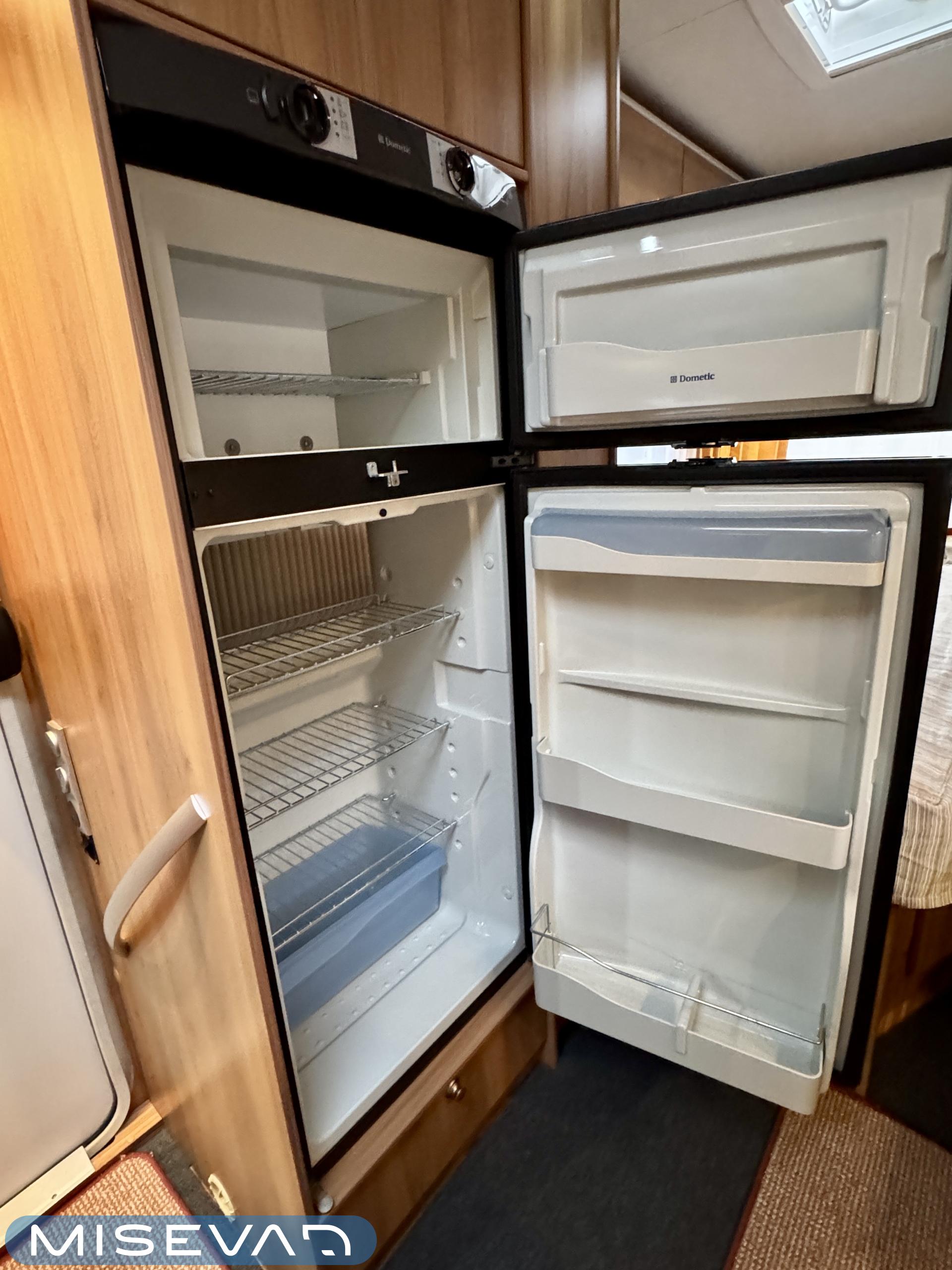 Keskeltä autoa löytyy L- keittiö, jonka varustukseen kuuluu iso jääkaappi erillisellä pakastinlokerolla.
