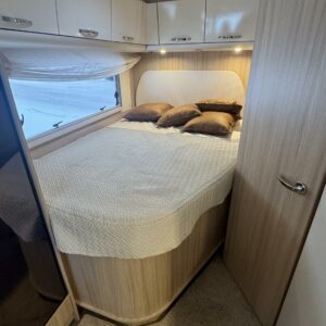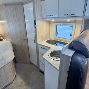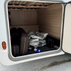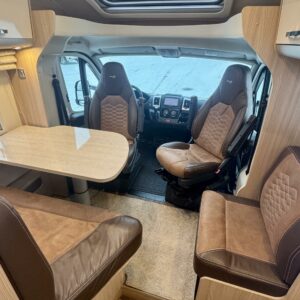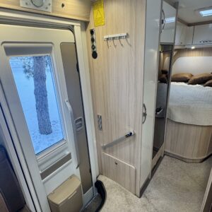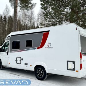 Vain kaksi käyttäjäomistajaa historiansa aikana ja molemmat ovat pitäneet autoa kuin kukkaa kämmenellä. On kyllä hienossa kunnossa säilynyt yksilö ja etenkin sisätilojen siisteys hivelee silmää. Vaaleat sävyt tuovat valoisuutta ja luovat avaruuden tuntua sisätiloihin. Takaosassa on pitkittäinen parivuode ja sen alle jää säilytystiloja. Heti vierestä löytyy WC-tilat. Keskelle autoa on sijoitettu L-keittiö ja jääkaappikin on ihan reilun kokoista mallia. Aina keskustellaan säilytystiloista, tai paremminkin niiden puutteesta, mutta tästä autosta korkeita vaatekaappeja löytyy jopa kaksin kappalein. Etuosan pöytäryhmään yhdistyvät kääntyvät ohjaamopenkit, sekä sivupenkki. Ohjaamossa kuljettajaa hellitellään automaattivaihteistolla, ilmastoinnilla, vakkarilla, sekä multimediasoittimella minkä näytöstä löytyy myös navigaattori ja peruutuskamera. Lämmitysjärjestelmänä on Trumticin tehokkain (6kw) ilmakeskuslämmitys ja sähköpatruunalla marinoituna. Moottorin esilämmitys hoituu Webaston avulla. Rekisteröidyt matkustuspaikat on neljälle henkilölle ja autoa voi ajaa henkilöauton (B) ajokortilla. Tule, näe, koe ja ihastu!