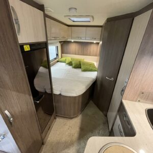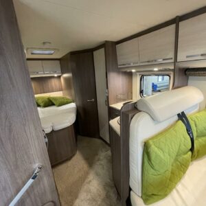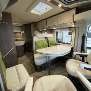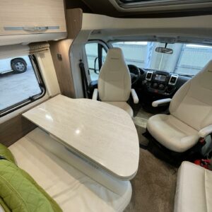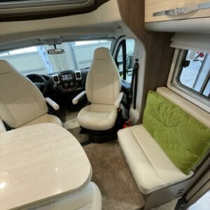 Takana ranskalaisvuode ja sen vieressä kylpyhuone/ WC, keskellä keittiö korkealla jääkaapilla ,edessä istuinryhmä sivusohvalla ja kääntyvin ohjaamon penkein. Tästä mahdollisuus tehdä parivuode.