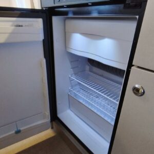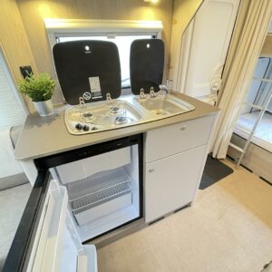 Keittiön altaat ja jääkaappi virheettömät, reilusti lasku- ja kulkutilaa vaunun keskellä ja valmiit makuupaikat neljälle.