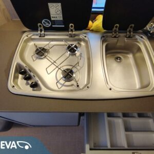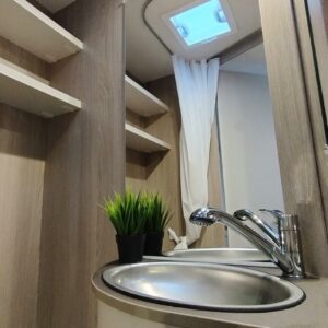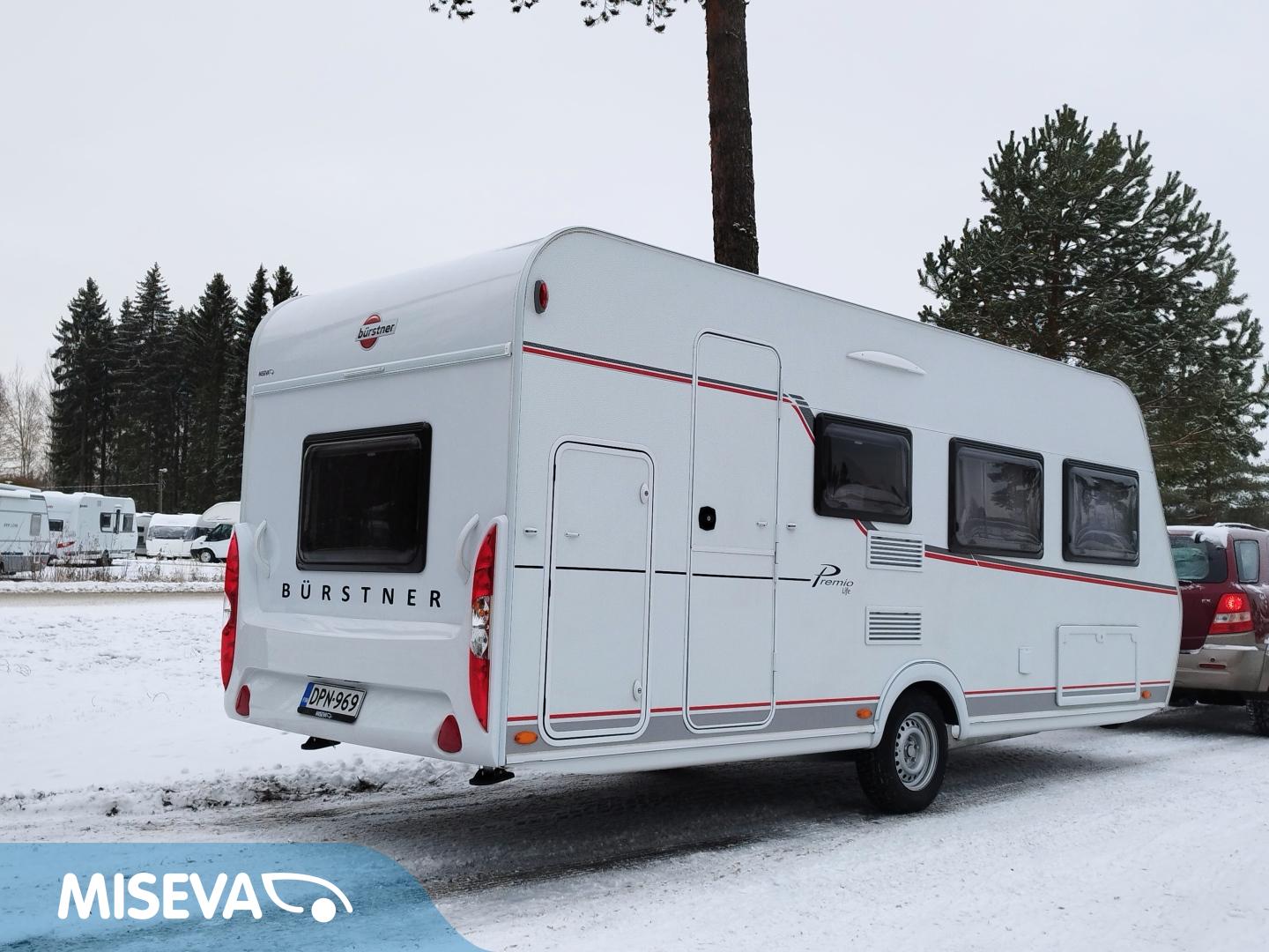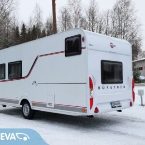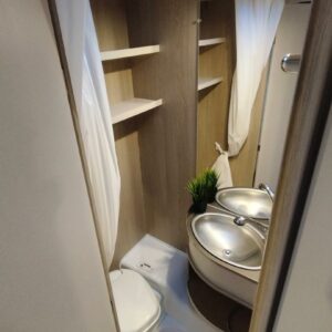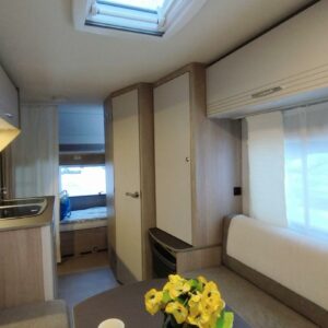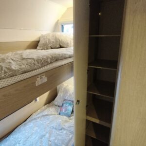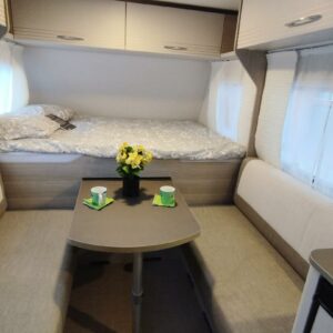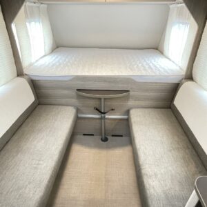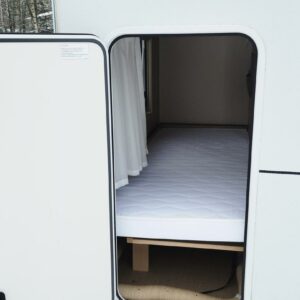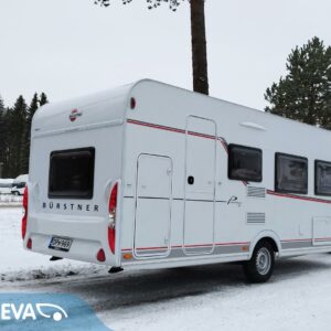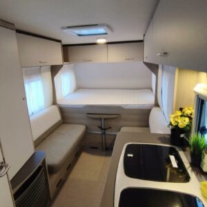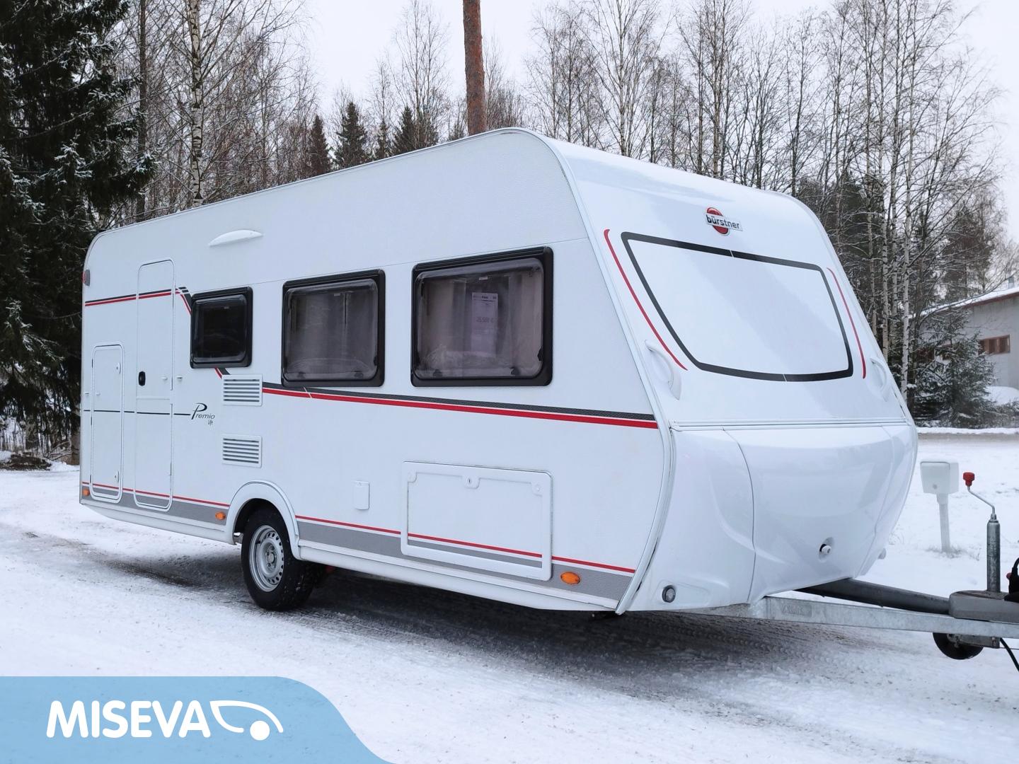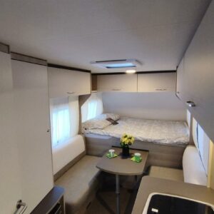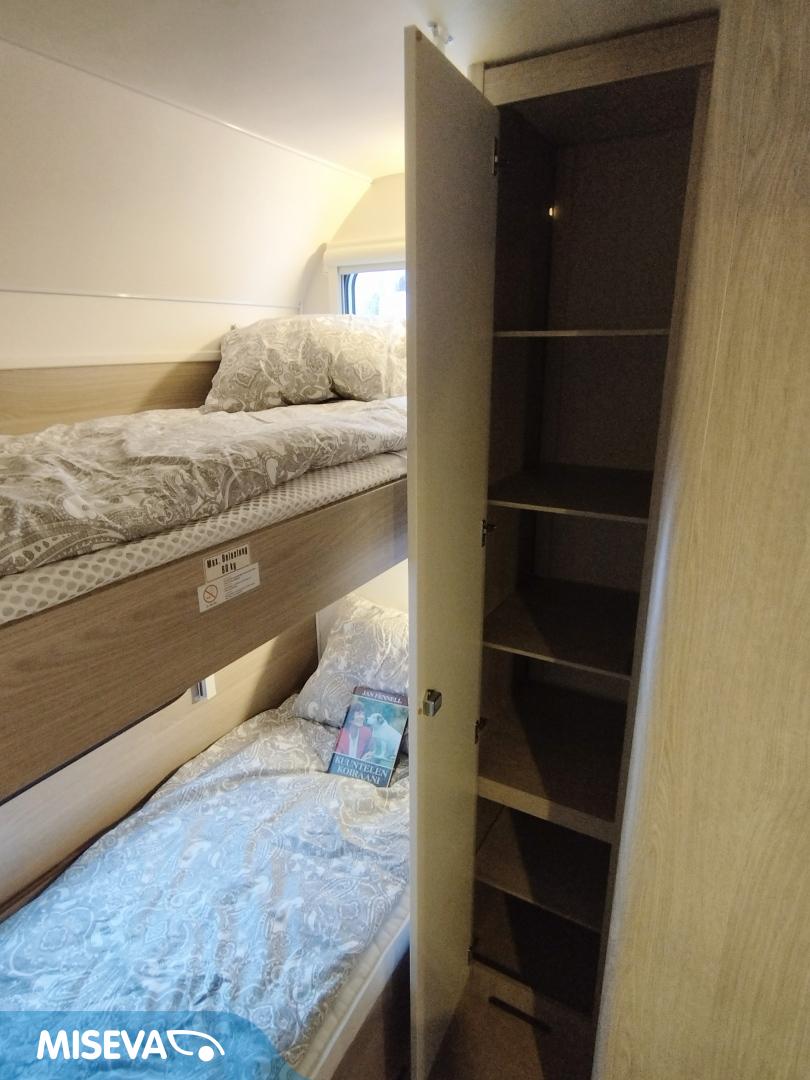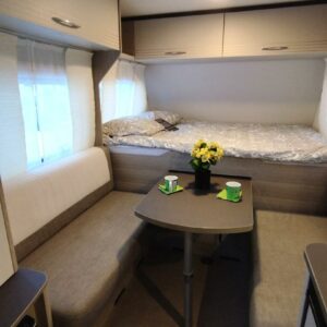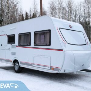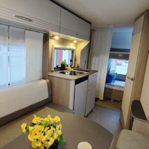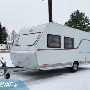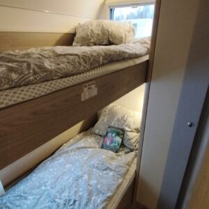 Uudenveroinen kerrosvuoteellinen perhevaunu. Takana kerrosvuoteet. Keskellä keittiö sekä wc tila suihkulla. Edessä pöytäryhmä ja kiinteä parivuode.