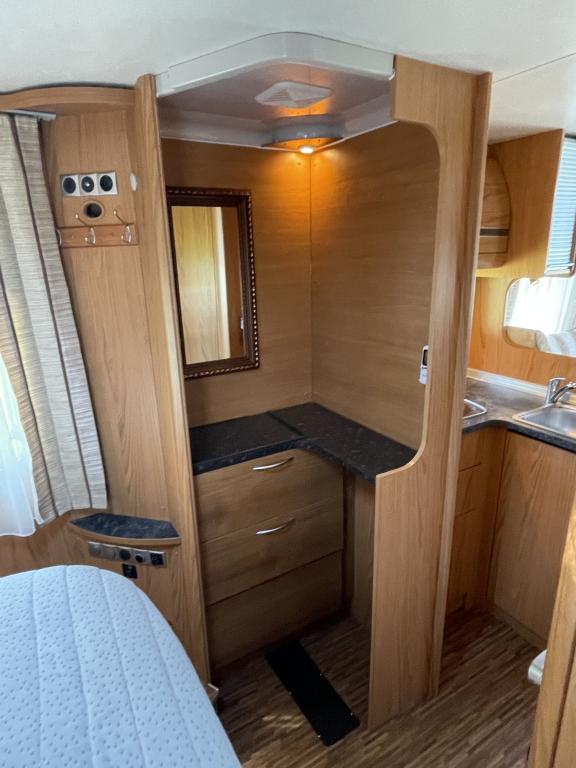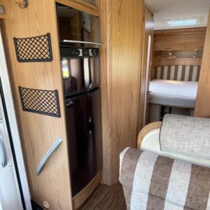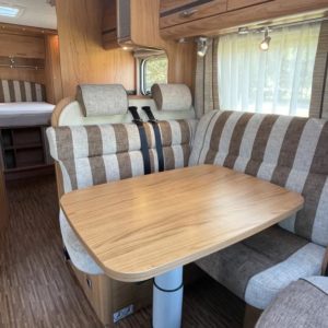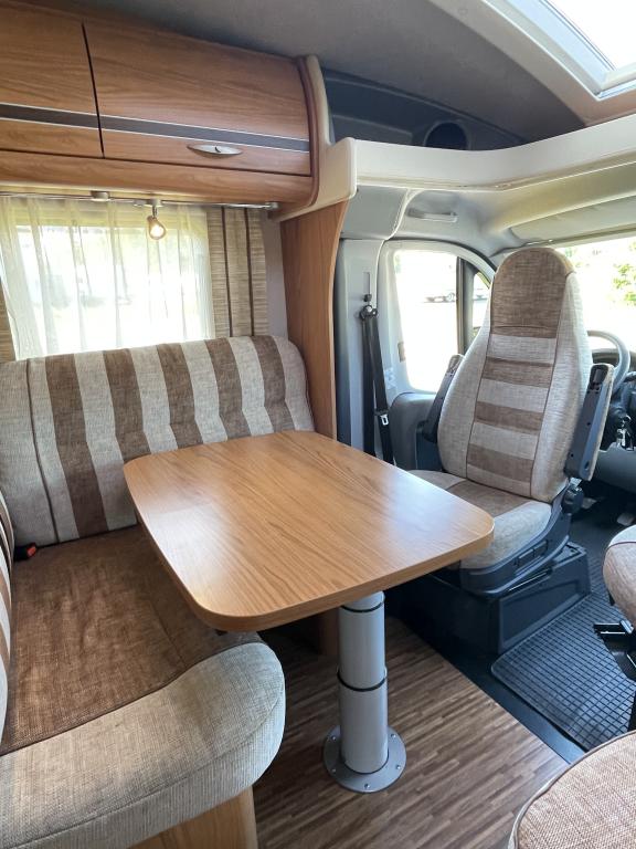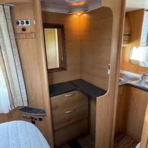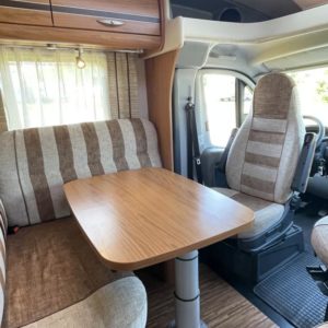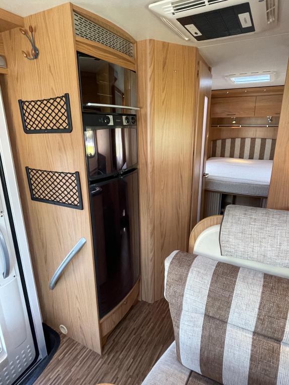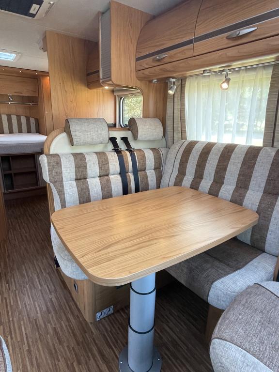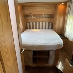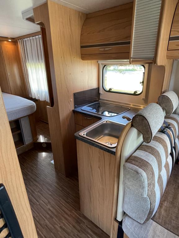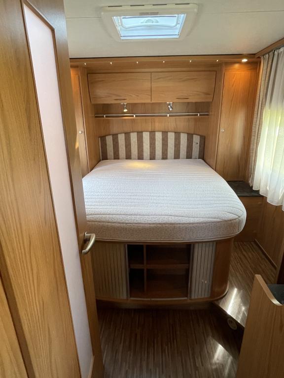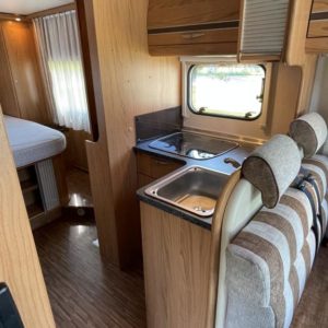 Auton takaoasassa muhkea saarekevuode, edessä viihtyisä ja valoisa L- pöytäryhmä lyhyellä sivusohvalla. Keittiön varustukseen kuuluu ison jääkaappi- pakastimen lisäksi kaasu- uuni.