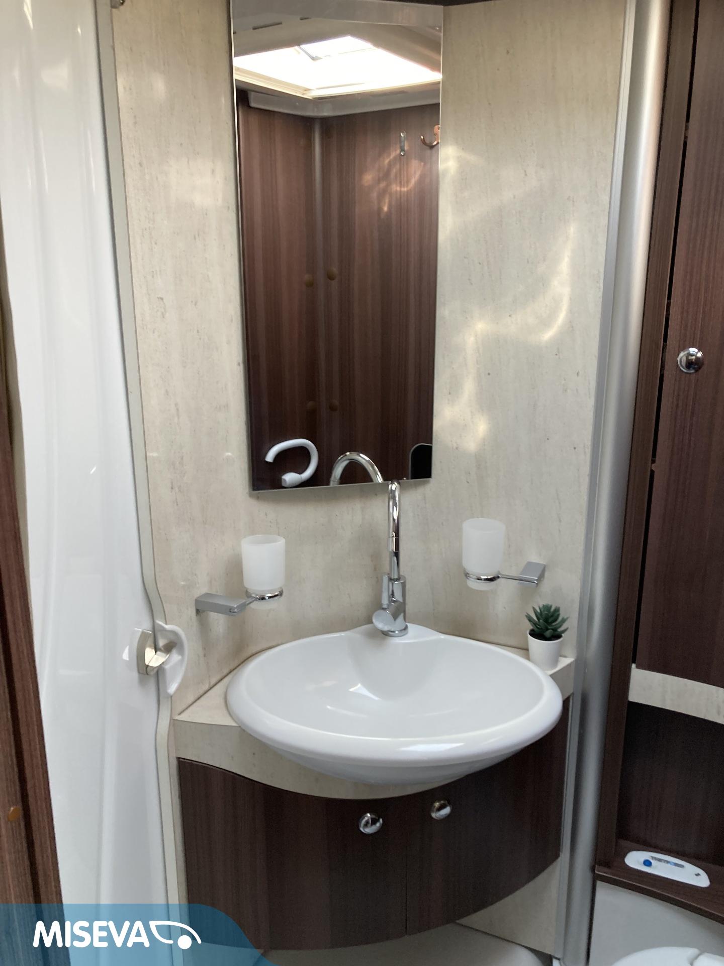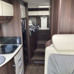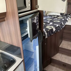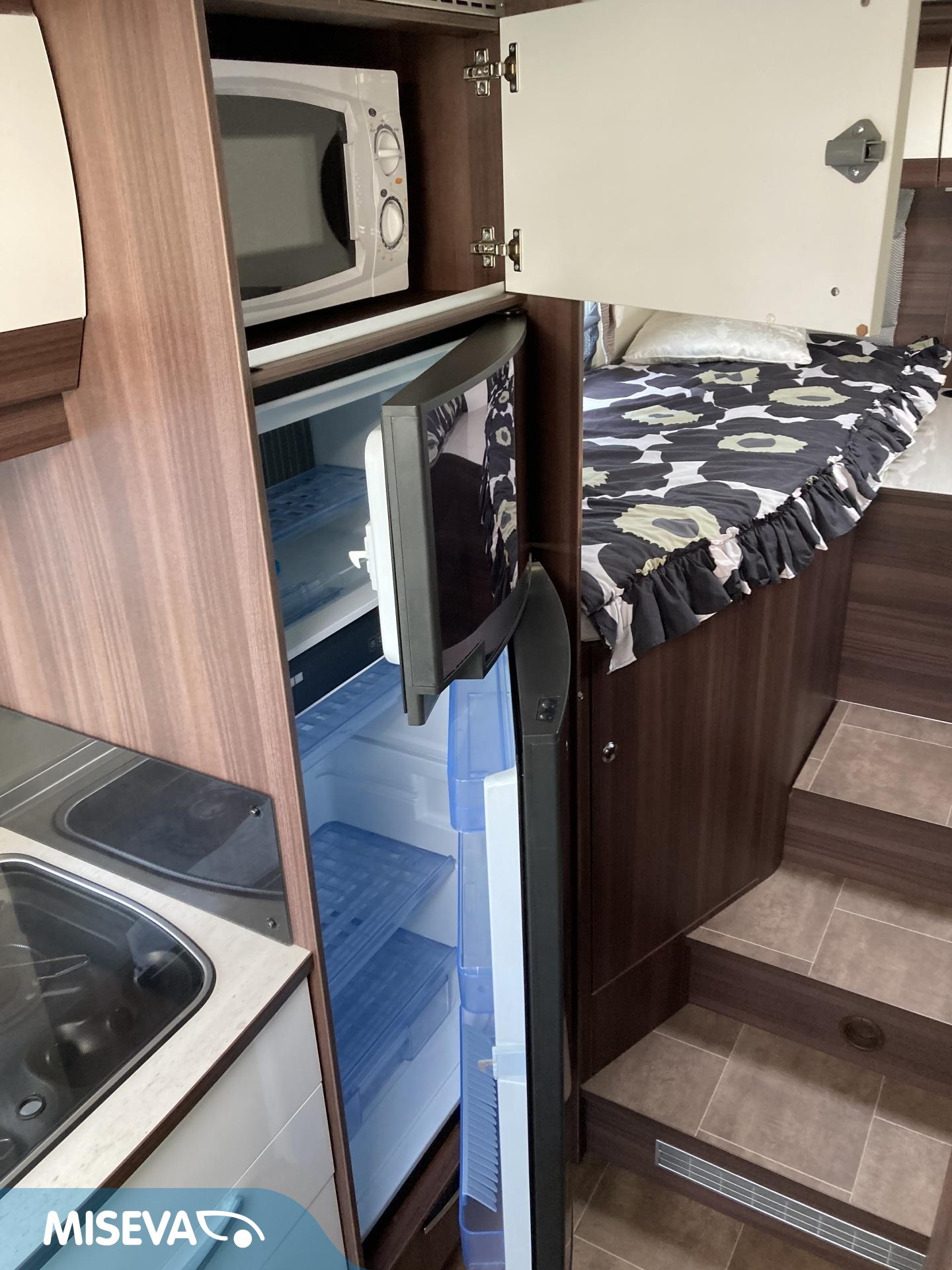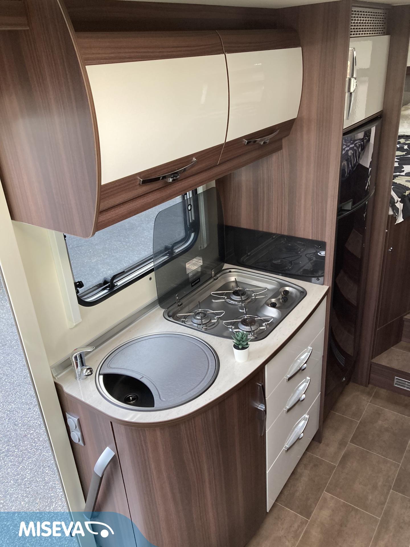 Keskellä matkailuautoa sijaitsee hyvin varusteltu keittiö, jossa voit valmistaa herkullisia aterioita joko liedellä tai käytännöllisellä mikroaaltouunilla. Ruoat säilyvät reissussa hyvin isokokoisessa jääkaapissa