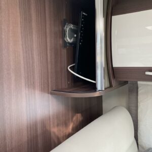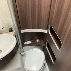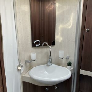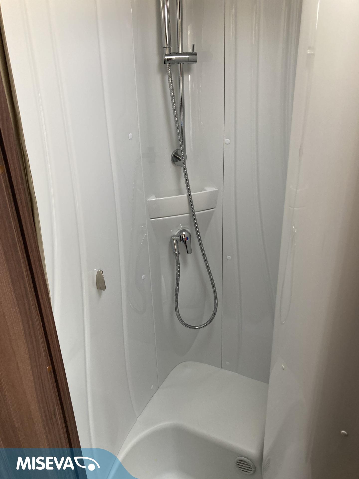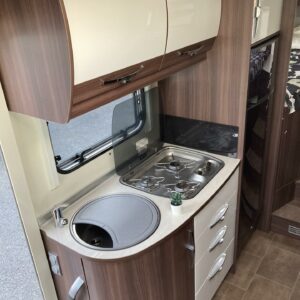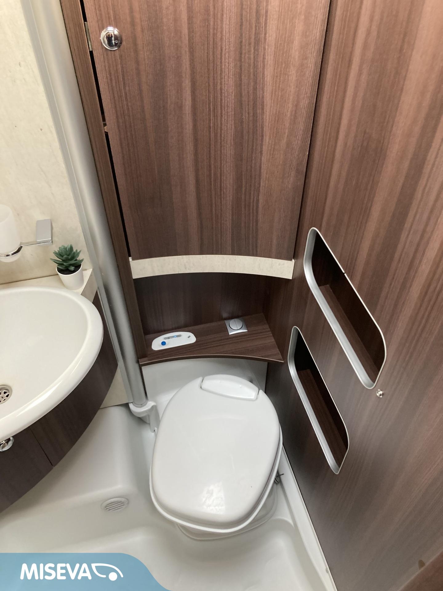 Keskellä matkailuautoa sijaitsee hyvin varusteltu keittiö, jossa voit valmistaa herkullisia aterioita joko liedellä tai käytännöllisellä mikroaaltouunilla. Ruoat säilyvät reissussa hyvin isokokoisessa jääkaapissa