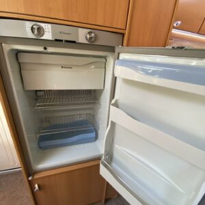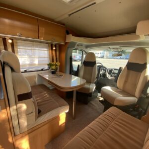 Hienompaa tämän ikäistä saa hakea ja jos löytyy, niin sittenhän niitä on kaksi. Malliesimerkki siitä miten autoa pidetään. On niin sisä kun ulkopinnoiltaankin todella mintissä kunnossa. Auton takaosaan on sijoitettu pitkittäinen parivuode ja sen vierestä löytyy tilava WC/kylpyhuonetila. Vuoteen alle jäävälle säilytystilalle on käynti myös auton ulkopuolelta. Keskeltä autoa löytyy L-keittiö ja säilytystiloja. Jääkaappi on mukavalla käyttökorkeudella, ei tarvitse kyyristellä lattian rajassa. Etuosaa hallitsee pöytäryhmä minne yhdistyvät kääntyvät ohjaamon penkit, sekä sivusohva. Lämmituksenä tehokas (6kw) ja nopeasti lämpöä tuottava Trumaticin Combi ilmakeskuslämmitys. Lämmittimestä löytyy kaasulämmityksen lisäksi sähkövastukset (sähköpatruuna) ja lämpimän käyttöveden tuottava lämminvesiboileri. Ohjaamossa kuljettajaa hellitään vakionopeudensäätimen lisäksi sähköisillä lasinnostimilla ja sähköpeileillä. Ja toki kesähelteille mukava varuste on myös ohjaamoilmastointi. Alpinen multimedianäyttö hoitaa musiikkitarjonnan ohella myös peruutuskameran kuvan ja ohjastaa perille navigaattorin avulla. Kesäkuussa -24 katsastettu ja juuri tarkastukset läpi käynyt matka-auto mikä kestää tarkemmankin tarkastelun.