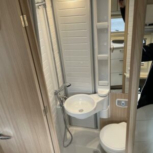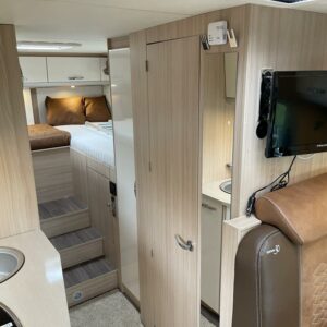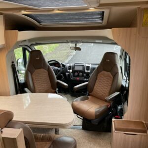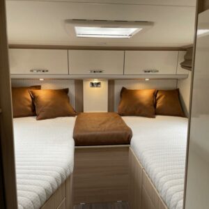 Valoisassa pohjaratkaisussa edessä pöytäryhmä sekä kääntyvät etuistuimet. Keskiosassa keittiö sekä wc -& suihkutila. Takaosassa erillisvuoteet sekä tilava takatalli.