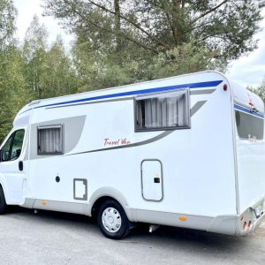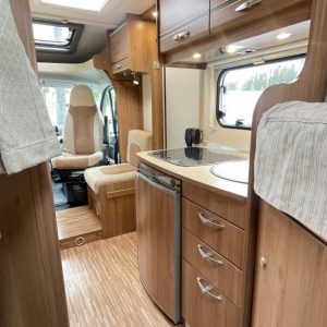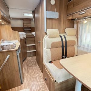 Pohjaratkaisussa edessä sohvaryhmä ja kääntyvät etuistuimet. Keskiosassa keittiö ja Wc & Suihkutila. Takaosassa erillisvuoteet joiden alla suuri takatalli.