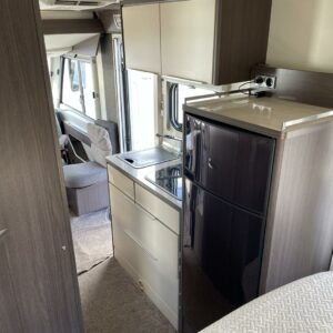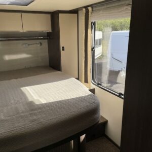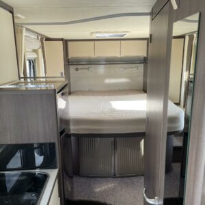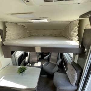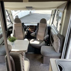 Pohjaratkaisuna edessä pöytäryhmä kääntyvin ohjaamon penkein sekä laskuvuode, takana saarekevuode ja WC / Suihkutila.